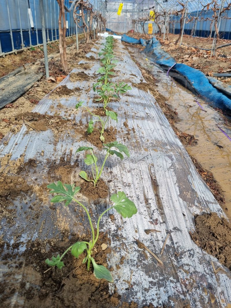 수박본밭에심기128포기 1)비닐깔고 2)점적호스깔고 3)구멍파고 4)물주고 5)토양살충제넣고 6)모종심고 7)부직포덮고 8)활대꽂고 9)비닐씌우고 10)부직포씌우고 11)겉비닐.부직포 크립으로 고정시켜 열고닫을때 시간단축효과증대