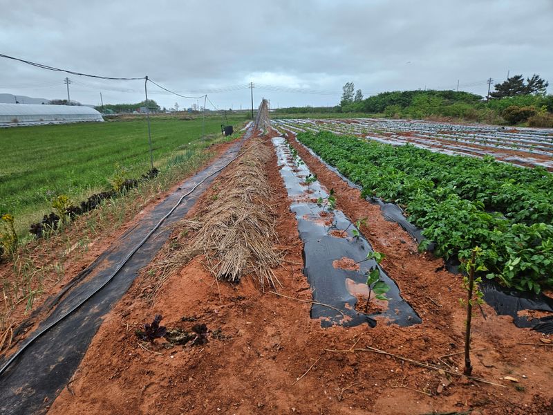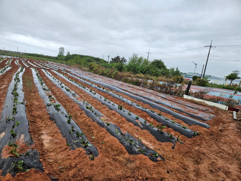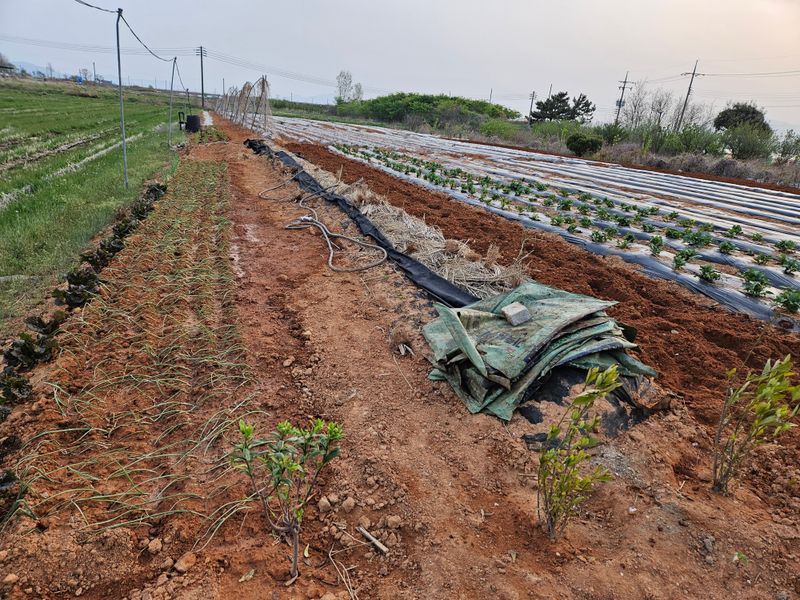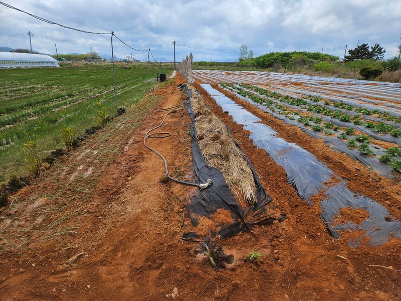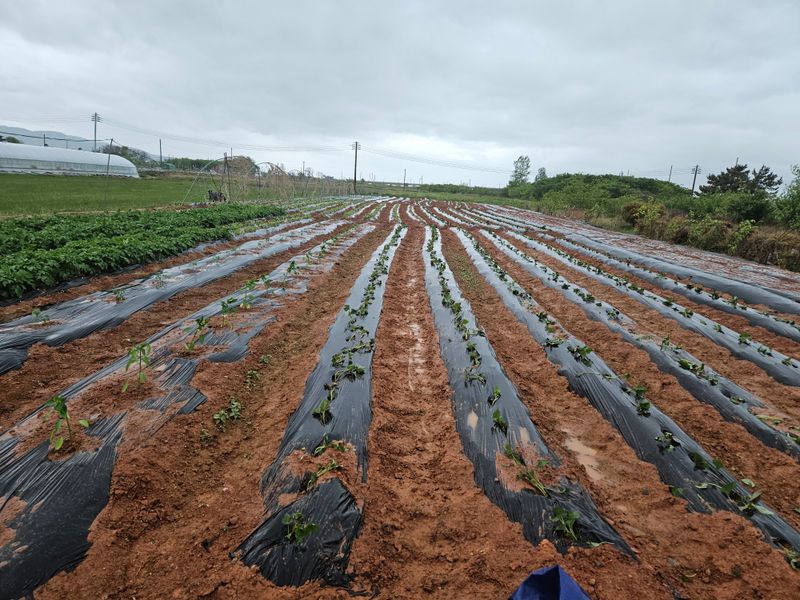 1. 비오는 날 고추등 정식 고구마: 밤고구마 10단, 꿀고구마: 5단 고추: 에이스탄, 칼탄 등 300주 아삭고추: 30주 가지, 대추토마토: 각 20주 오이: 10주 2. 고추밭 부직포깔기, 줄묶기 등 정식후 작업 참깨 심고 덮은 부직포 제거