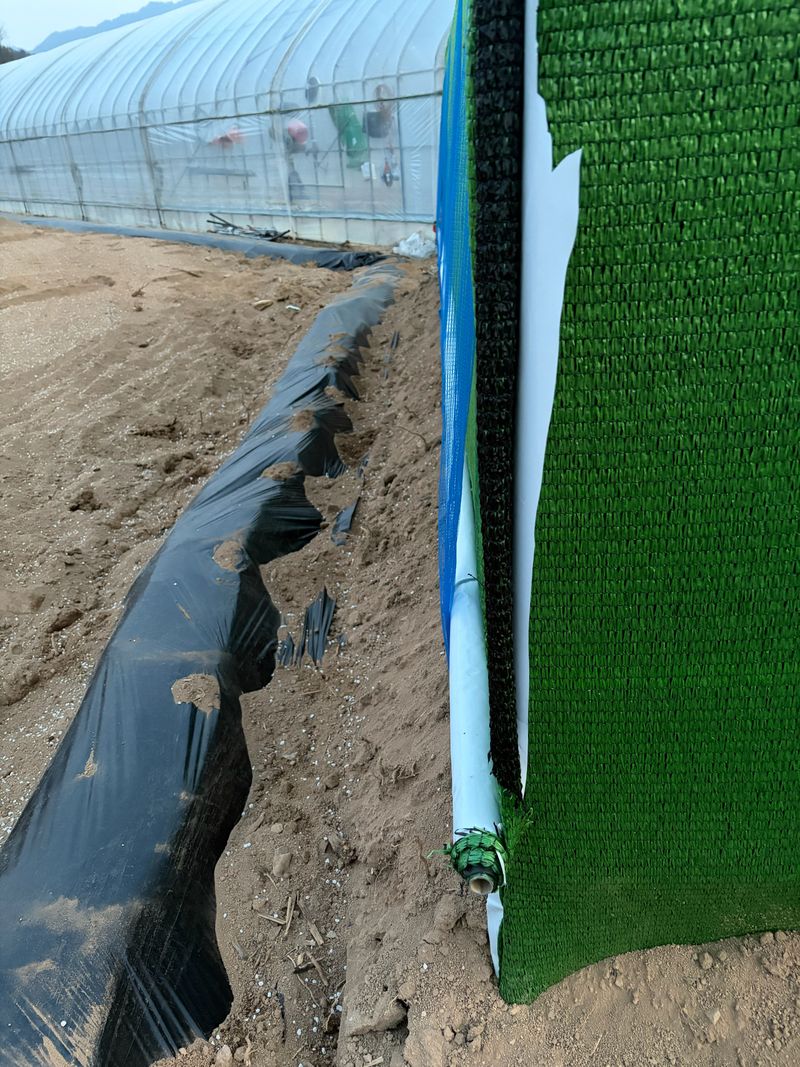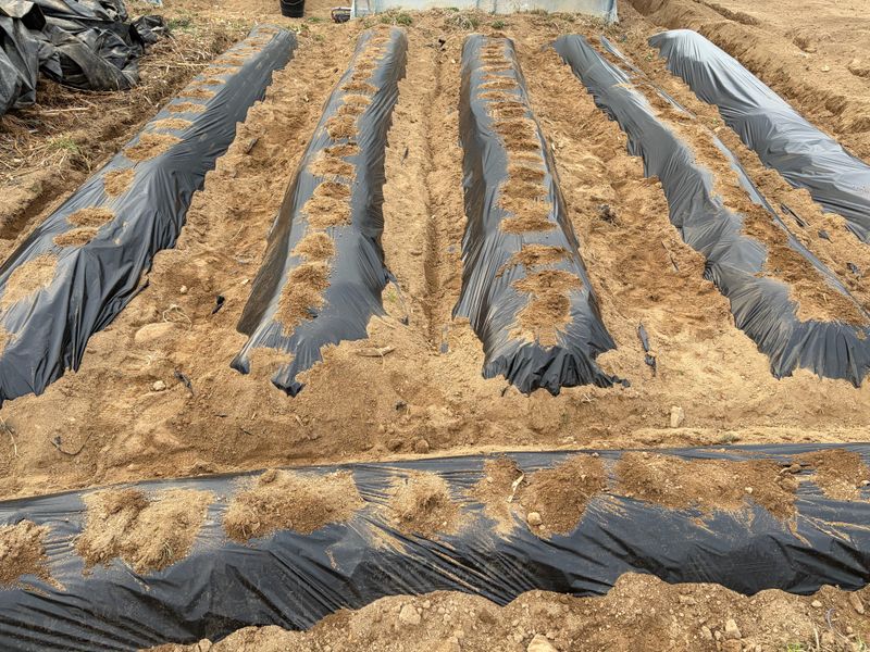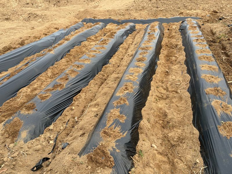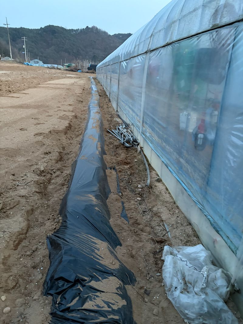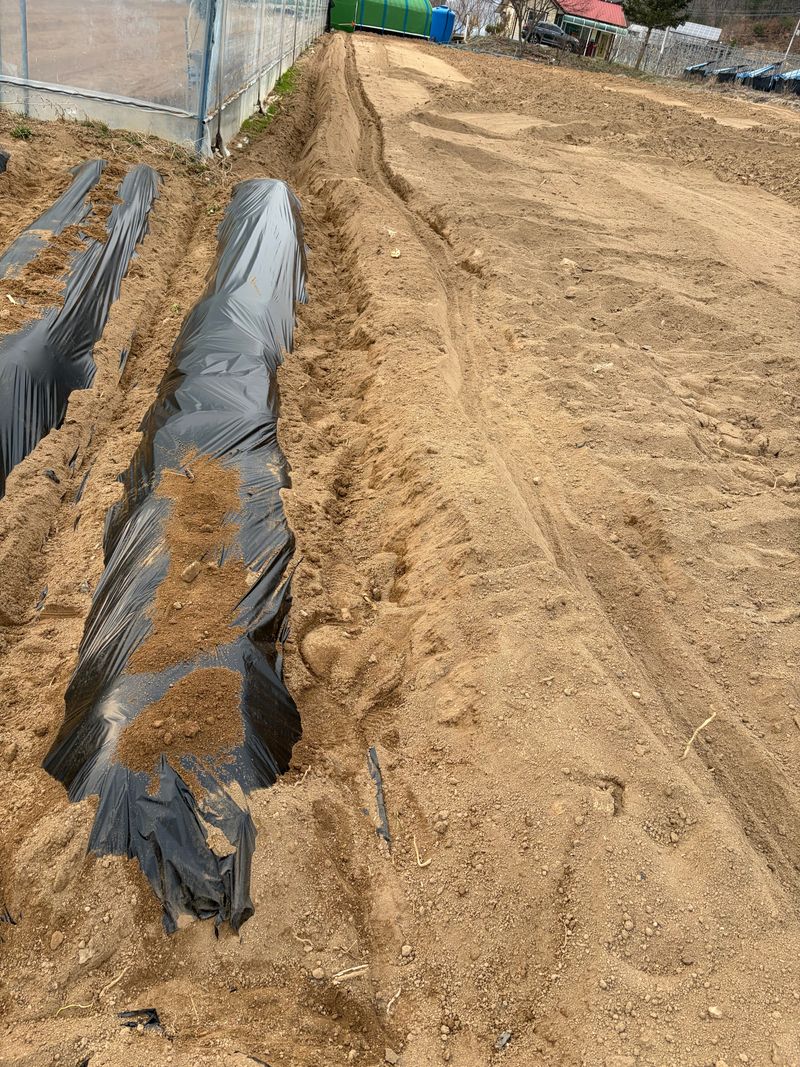 점적호스 깔고 비닐 멀칭 날씨가 변화무쌍 비, 눈, 우박, 바람 엄청추웠다