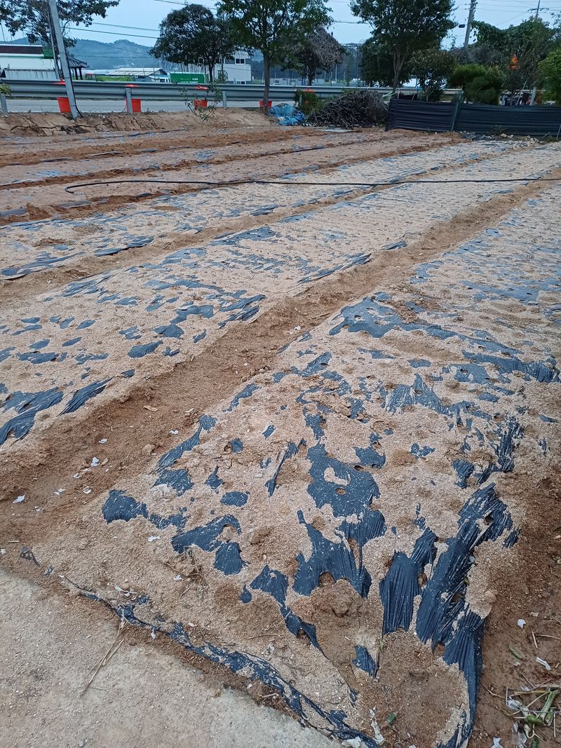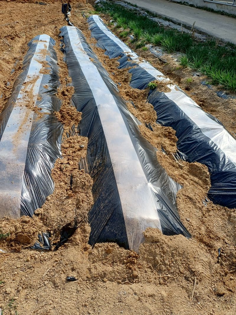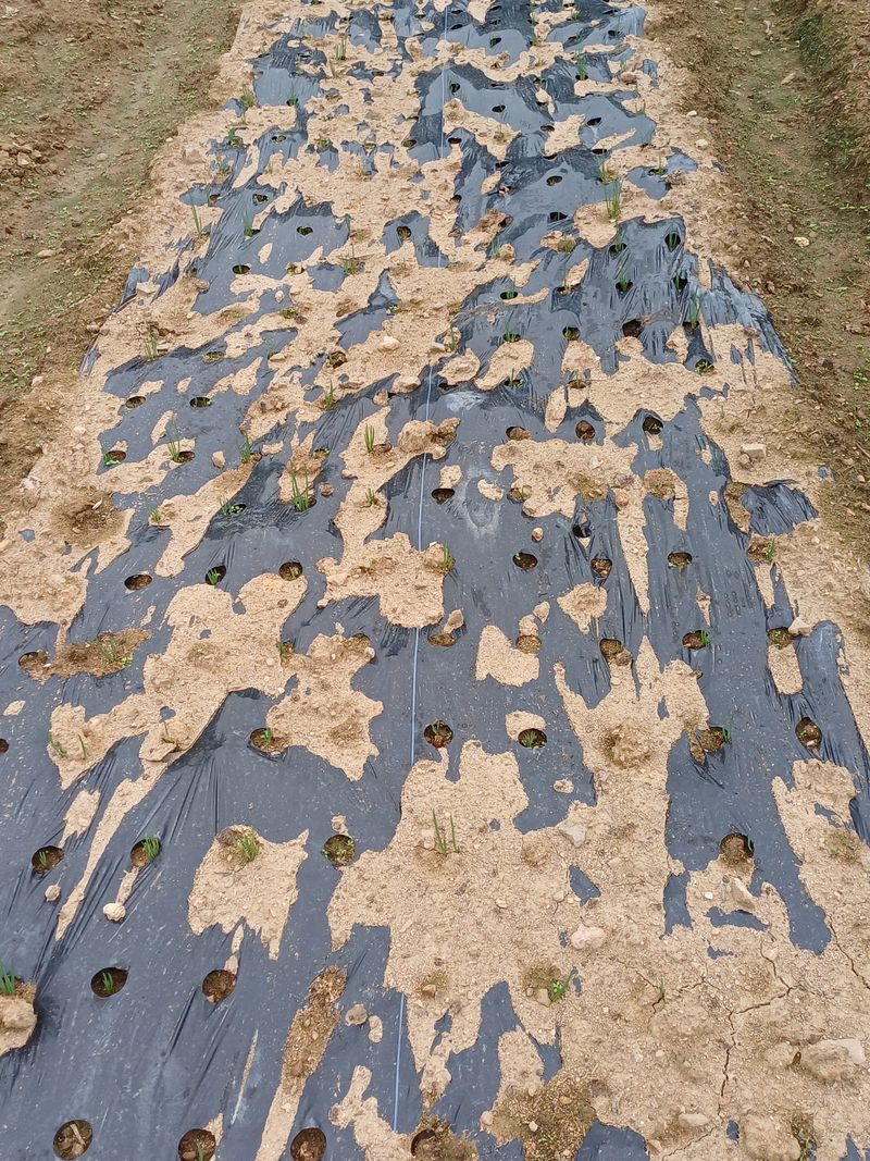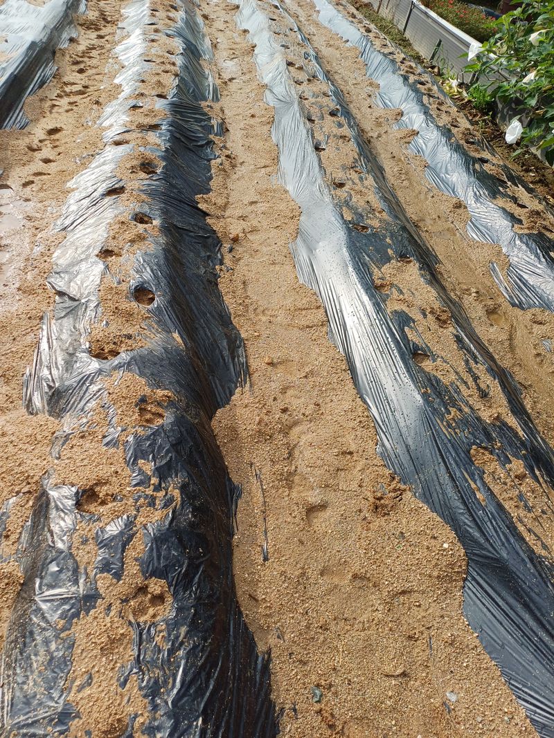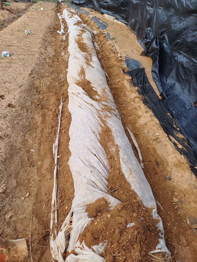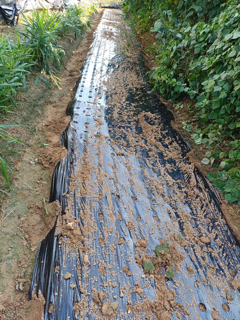 생강 한줄 파종 1.2키로 사와서 모두싹 .락스로 소독후 파종.집으로 덮어주고 부직포로 고정완료!