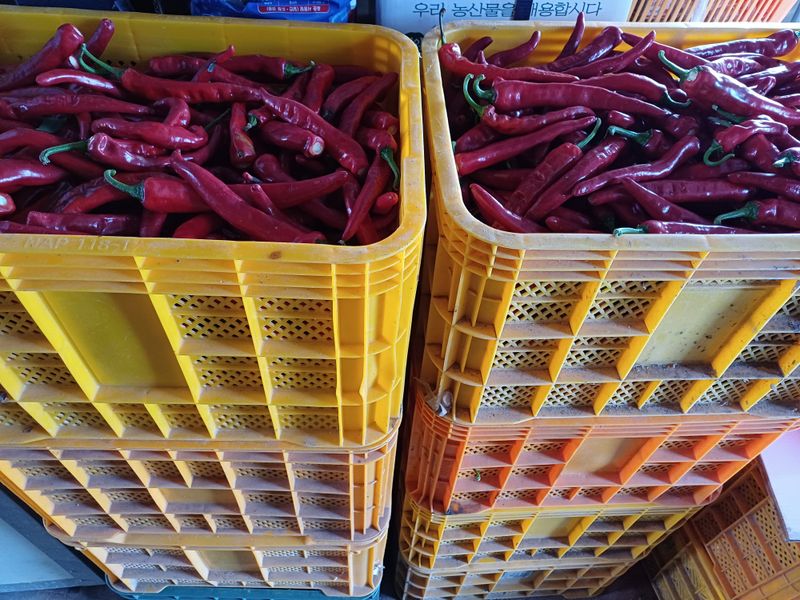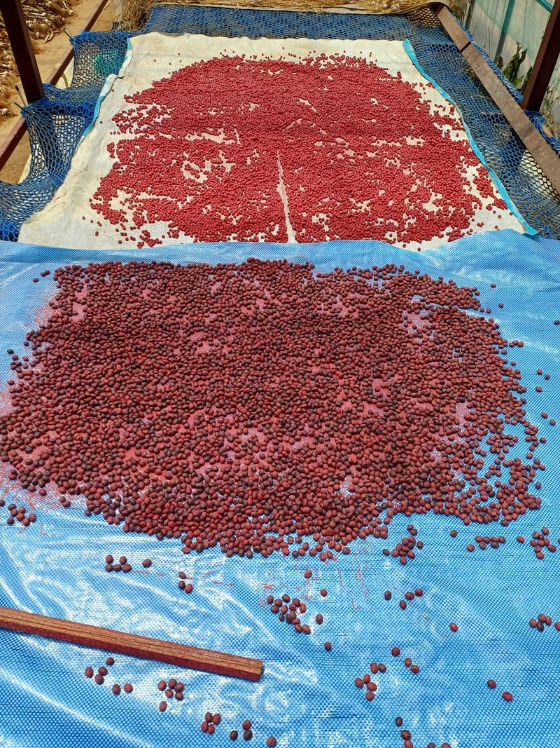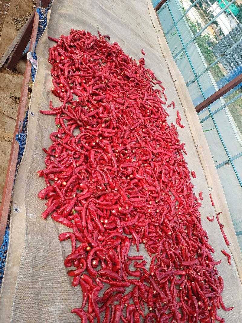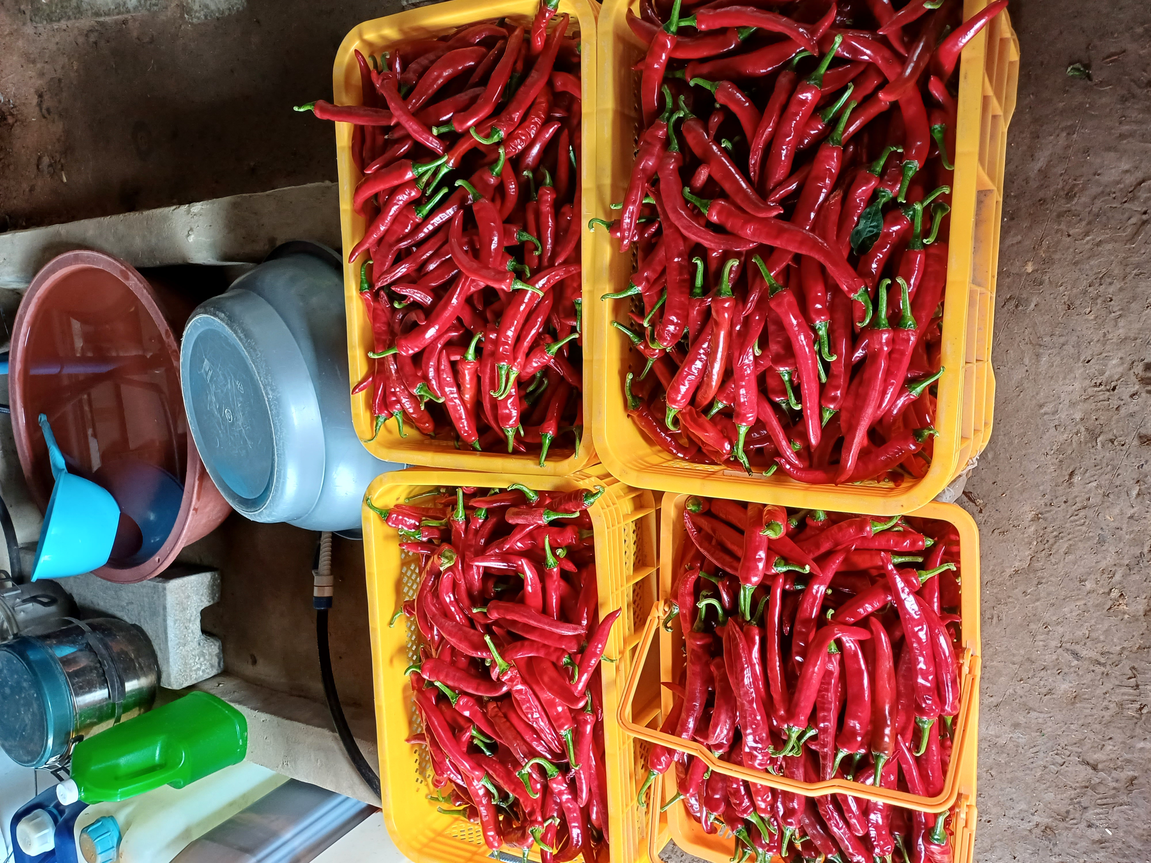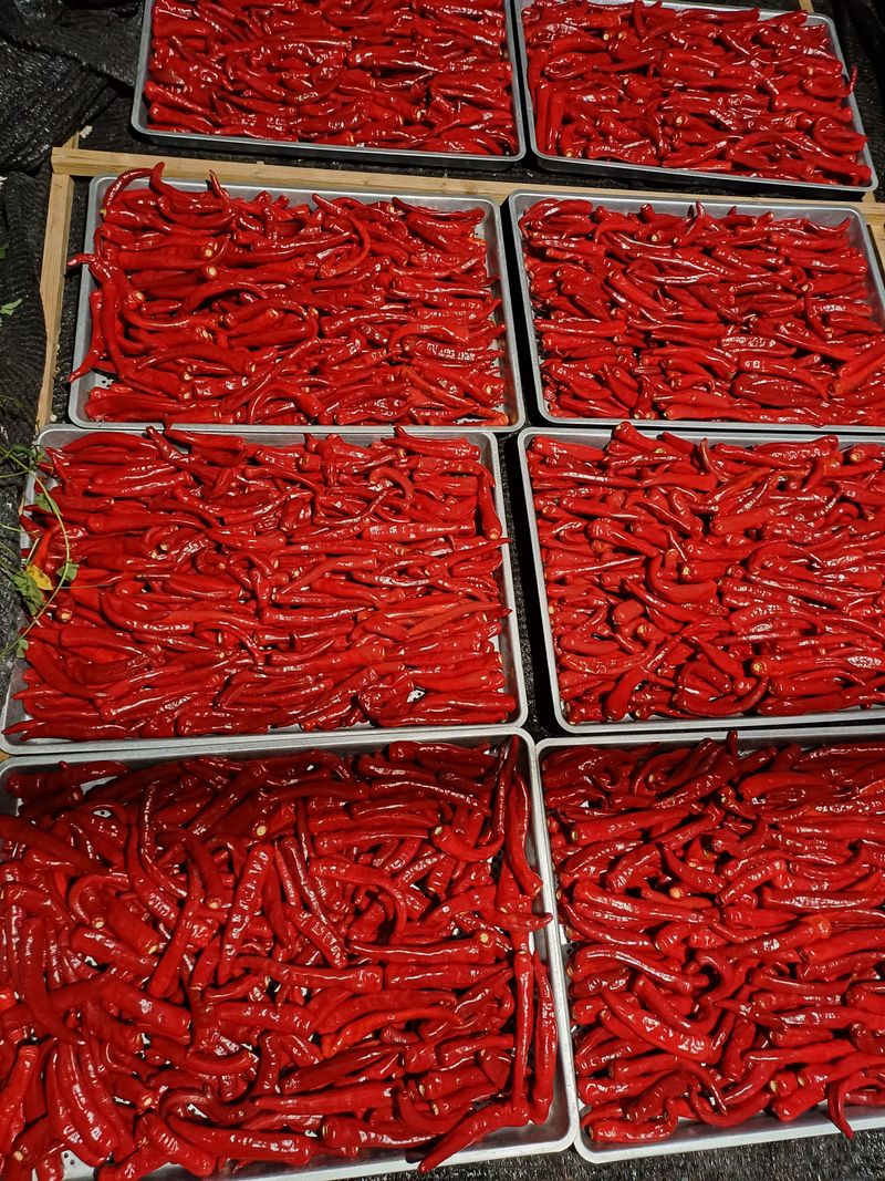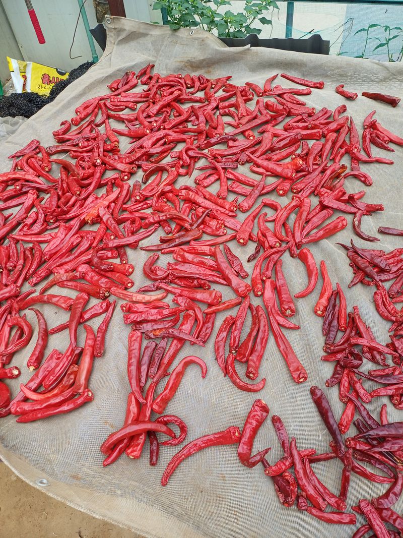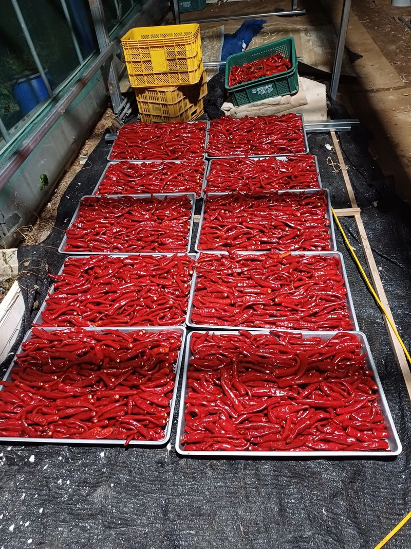 두물 고추 약 60키로 수확후 식초 퐁퐁으로 세척후. 건조기 55도로 48 시간 셑팅 이틀후 하우스로 이동 햇빛으로 완전 건조