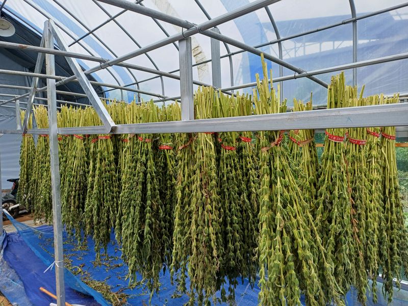 비오는 하우스안에서 마누라와 어제 땀범벅으로 베어낸 참깨 잎 따 내고 꺼꾸로 매달아 건조