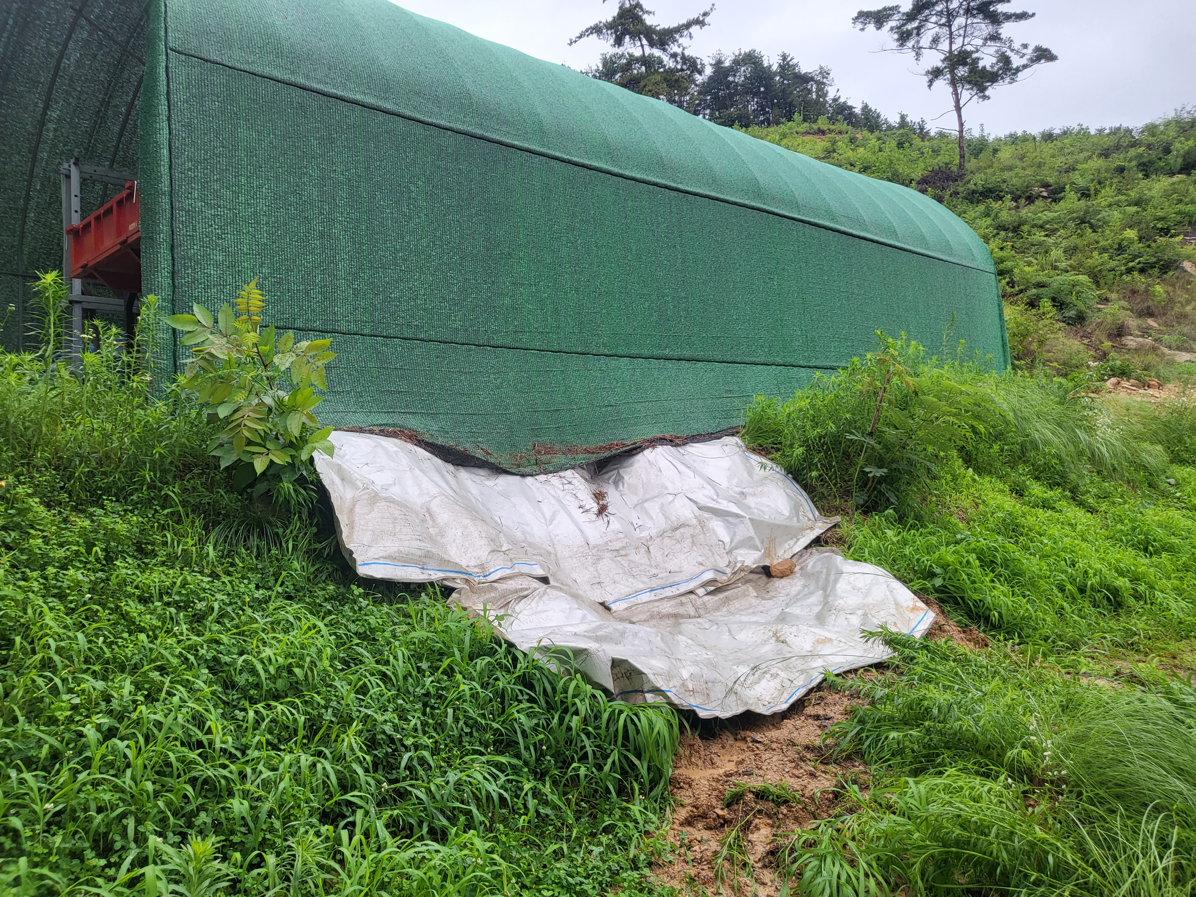 호우주의보로 과수원 답사실시 농기계창고 부분 슬라이딩 폭3.0m 높이1.5m 비날로 피복 장마후 식생토낭 복구
