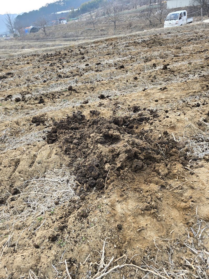 약 5톤 정도의 퇴비 트랙터 로더 이용하여 6마지기 밭에 퇴비 분배하고 기존에 퇴비살포기로 살포하고 빠진 부분 삽이용하여 골구루 펴는 작업 함.