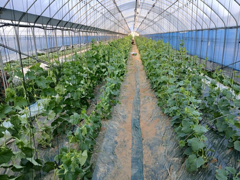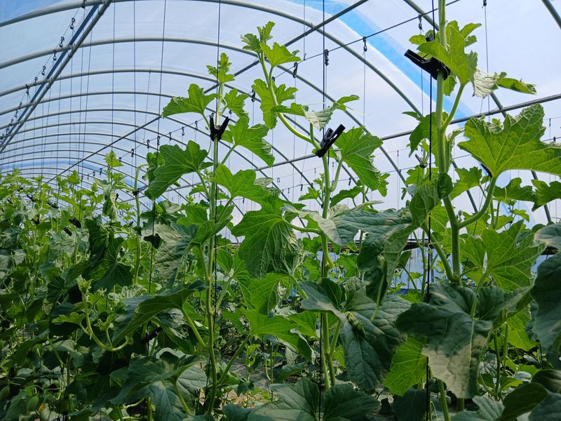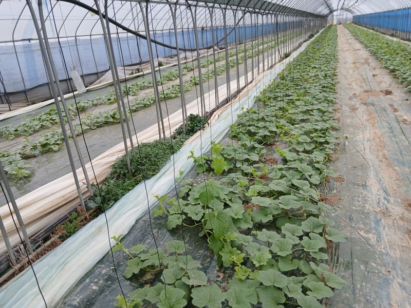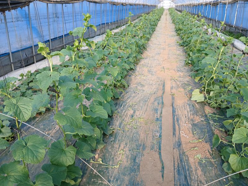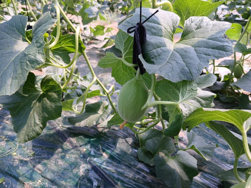 멜론겨드랑순제거.끝순마감 양말목 열매.먀달기작업 관수동당3톤 초기비료관주30-10-10동당1.8킬로관주 비대기입니다