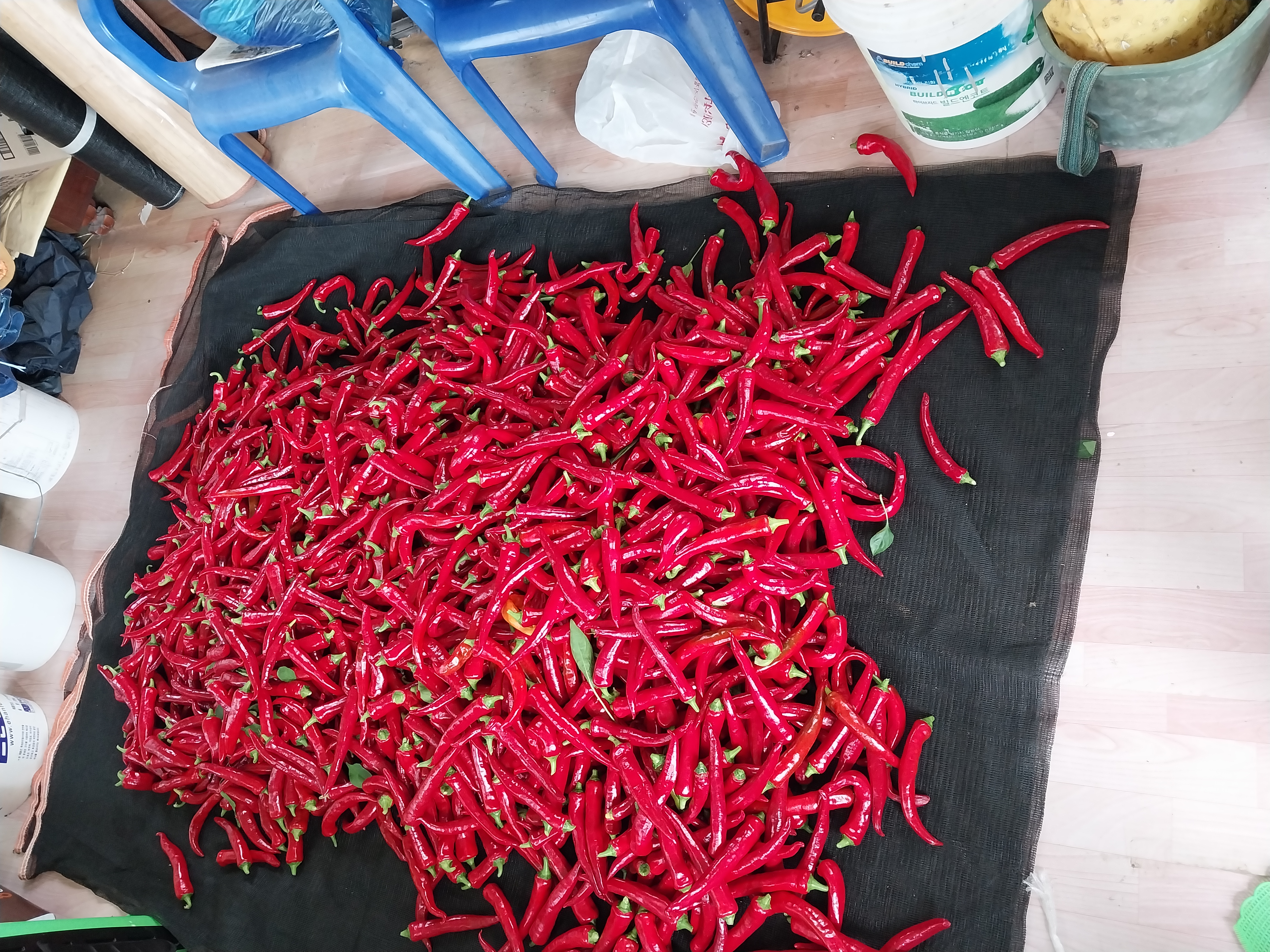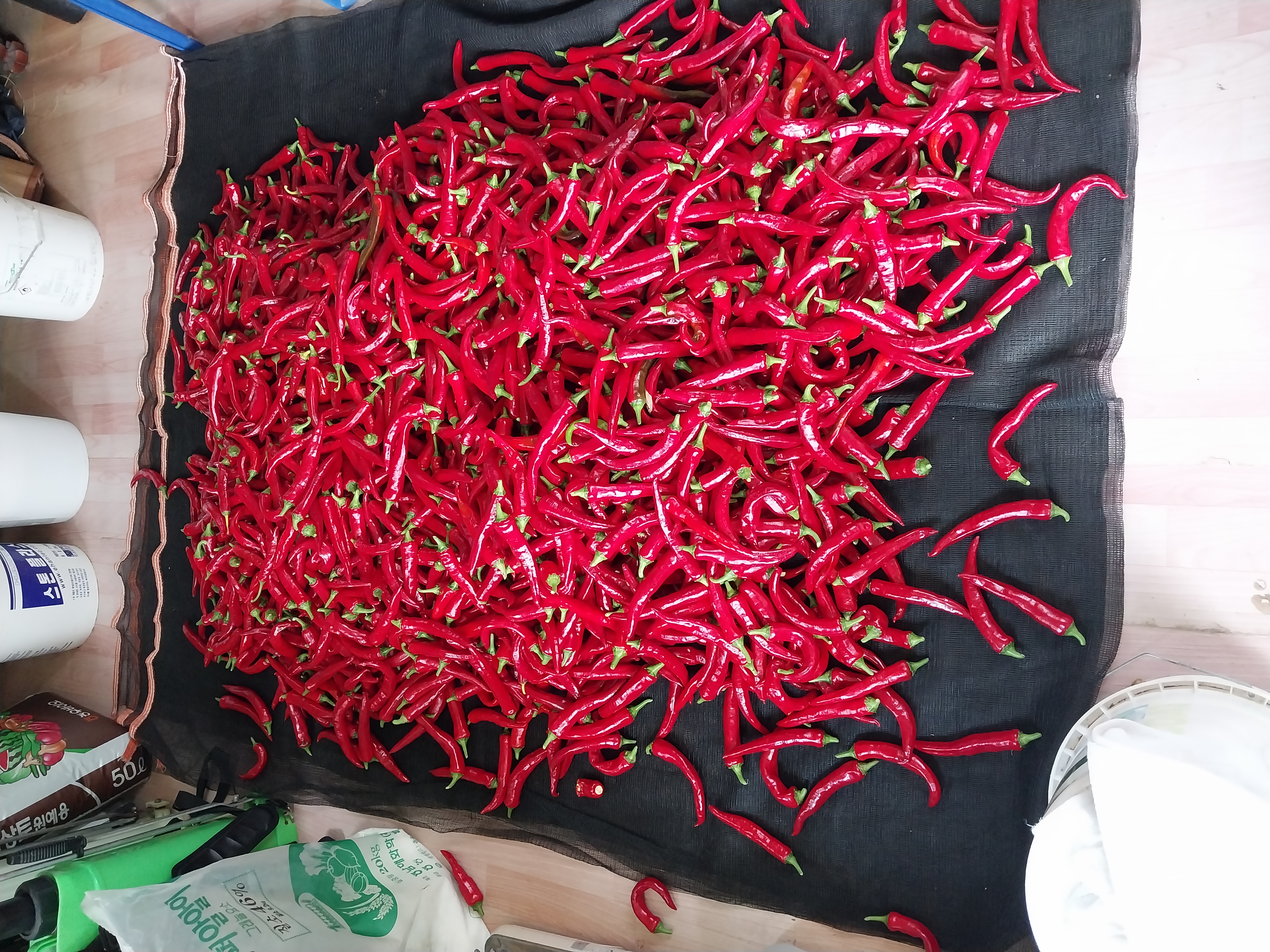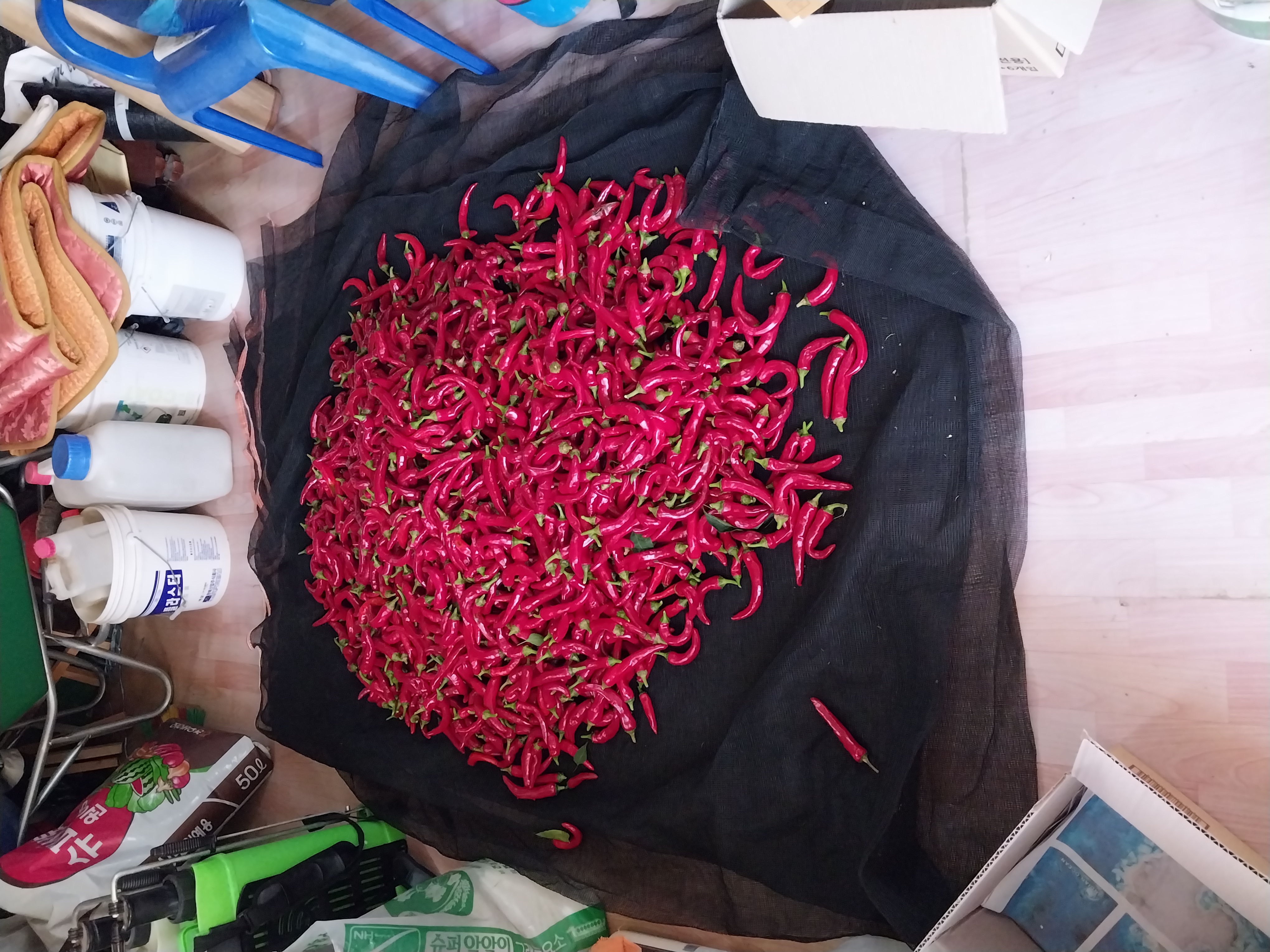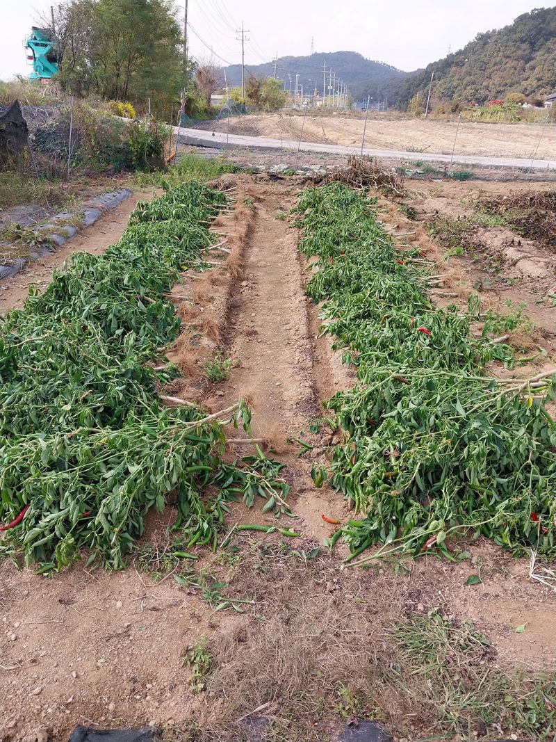 얼룩찰옥시기 수확후 옥수수대 잘라내기 2차 고추건조양 : 6.4km ( 60도에 70시간 건조) 가지수확