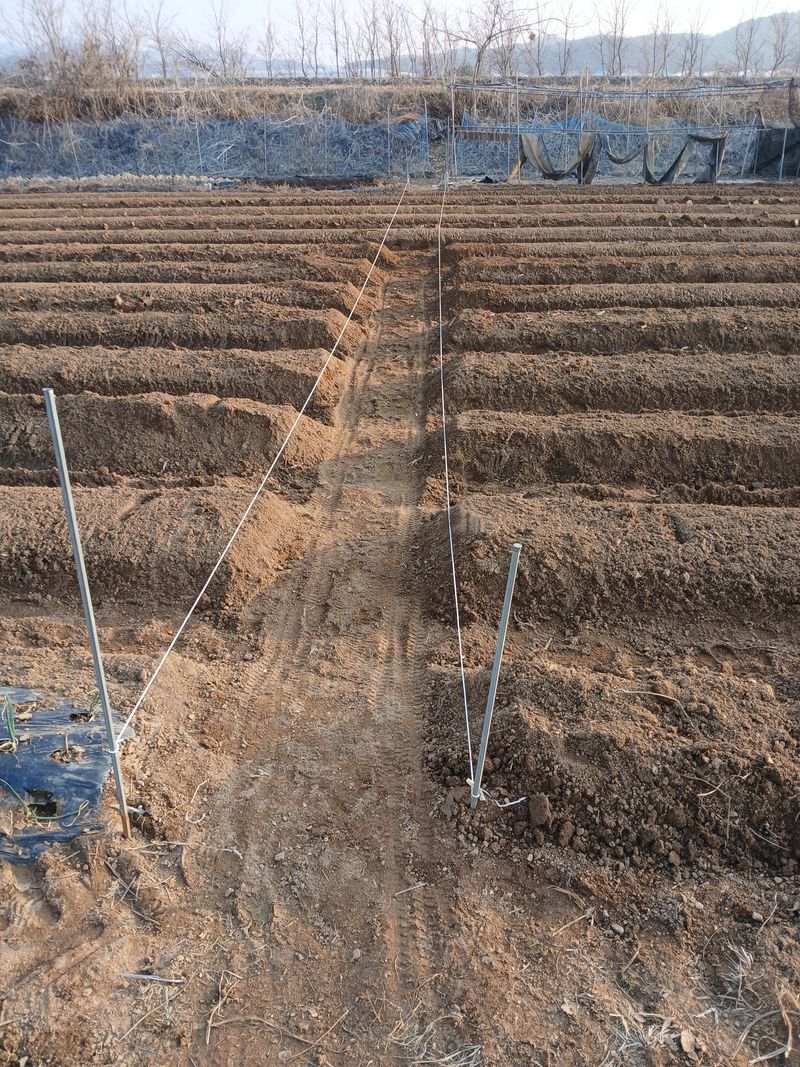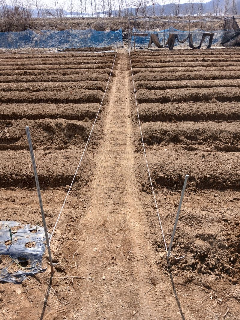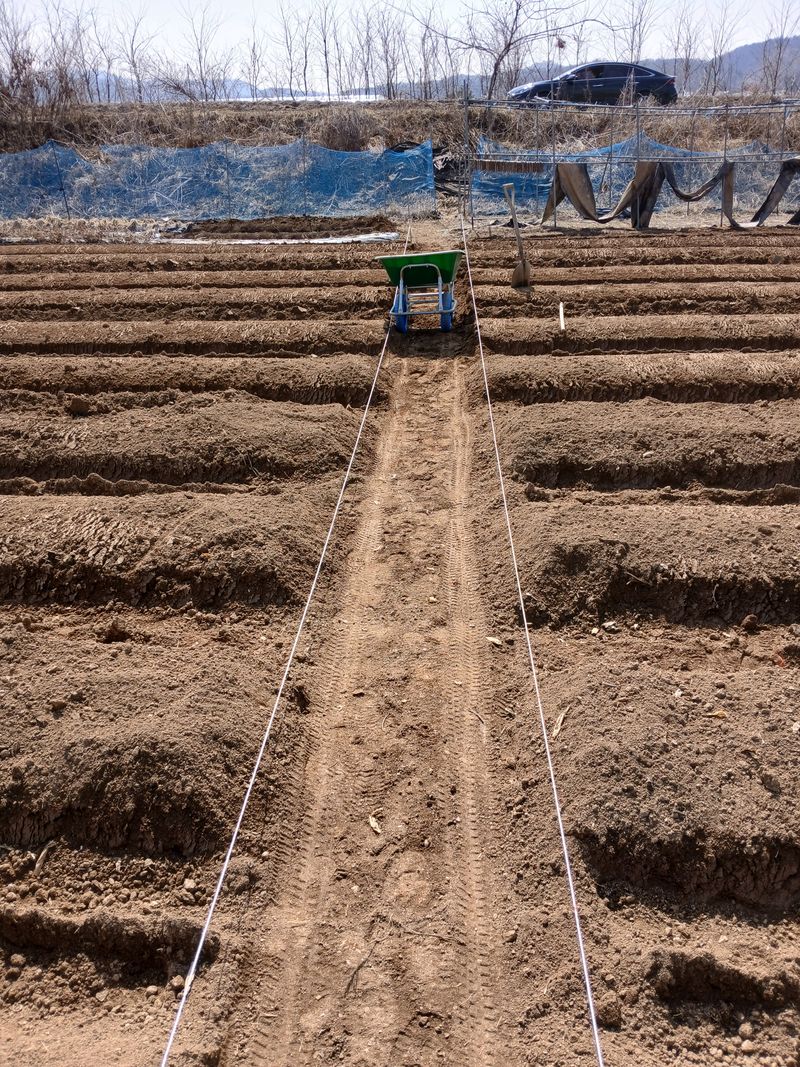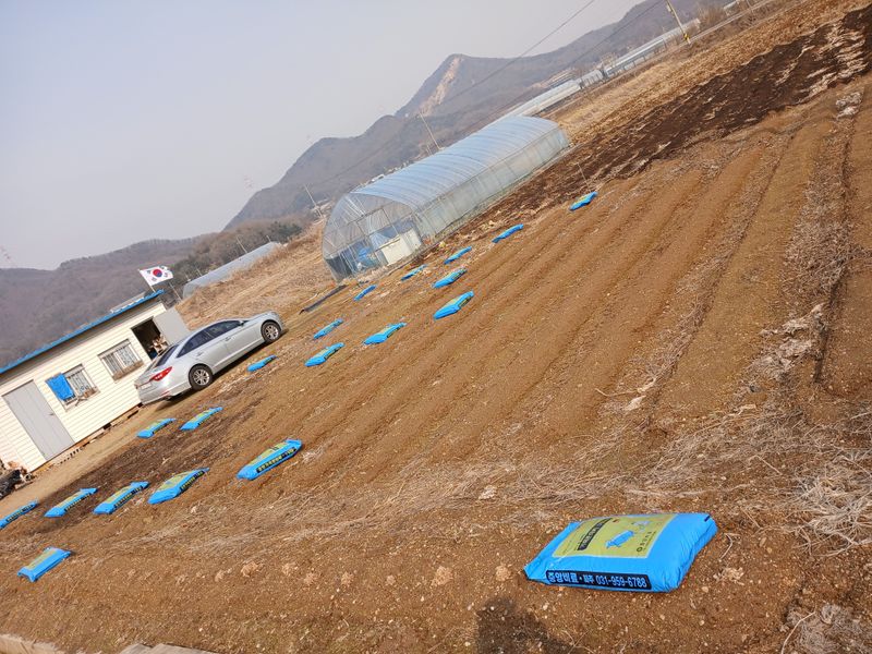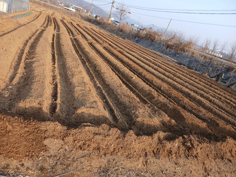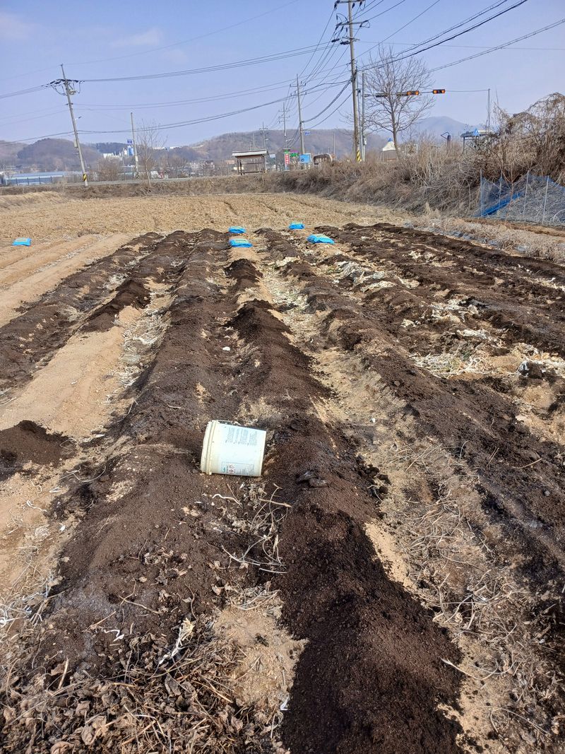 밭 주변 제초제 살포 완두콩 수확후 이랑만들기 토양살충제 , 복합 비료, 유황칼슘 가축분퇴비 1포 살포후 흙 뒤집기
