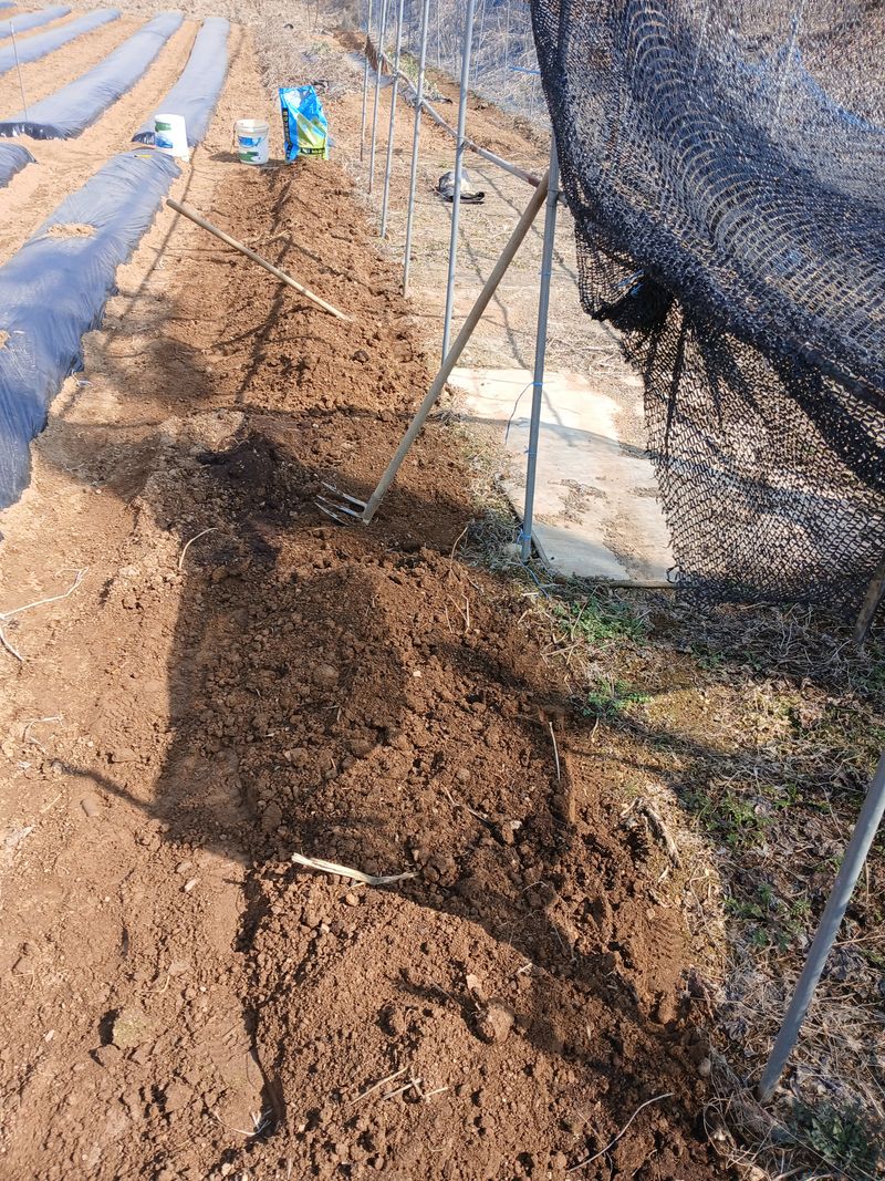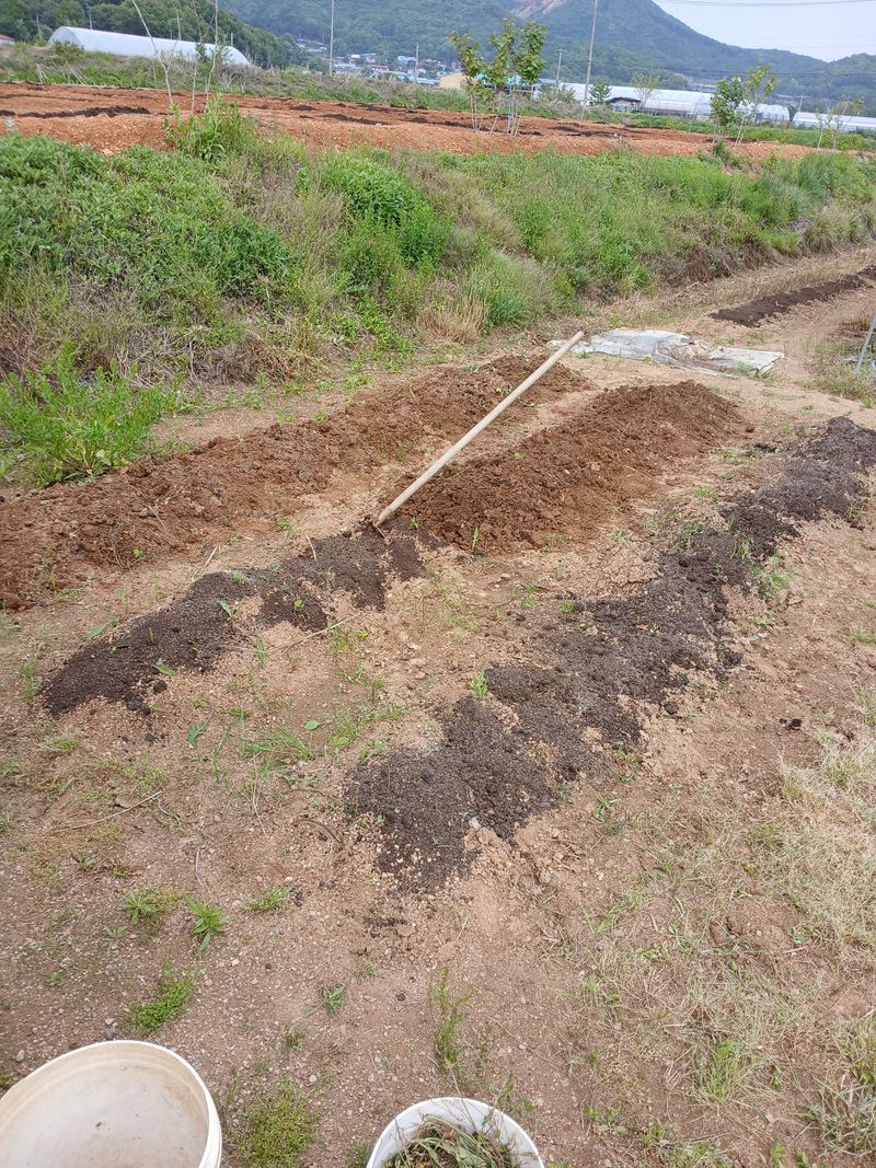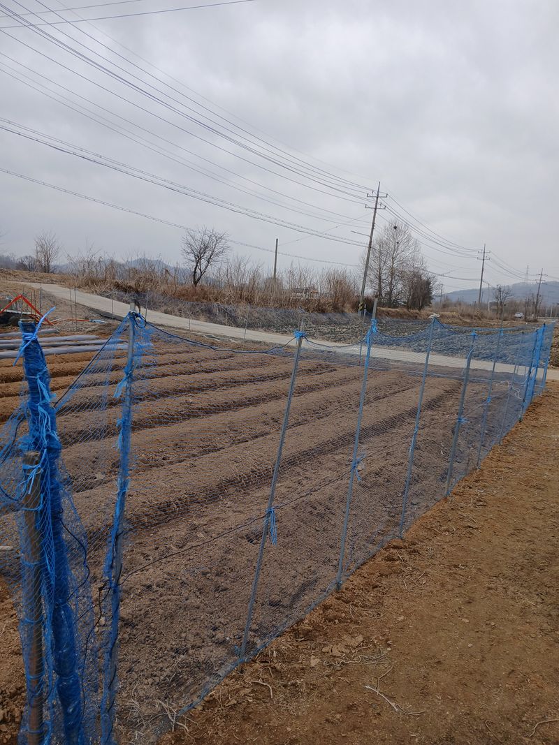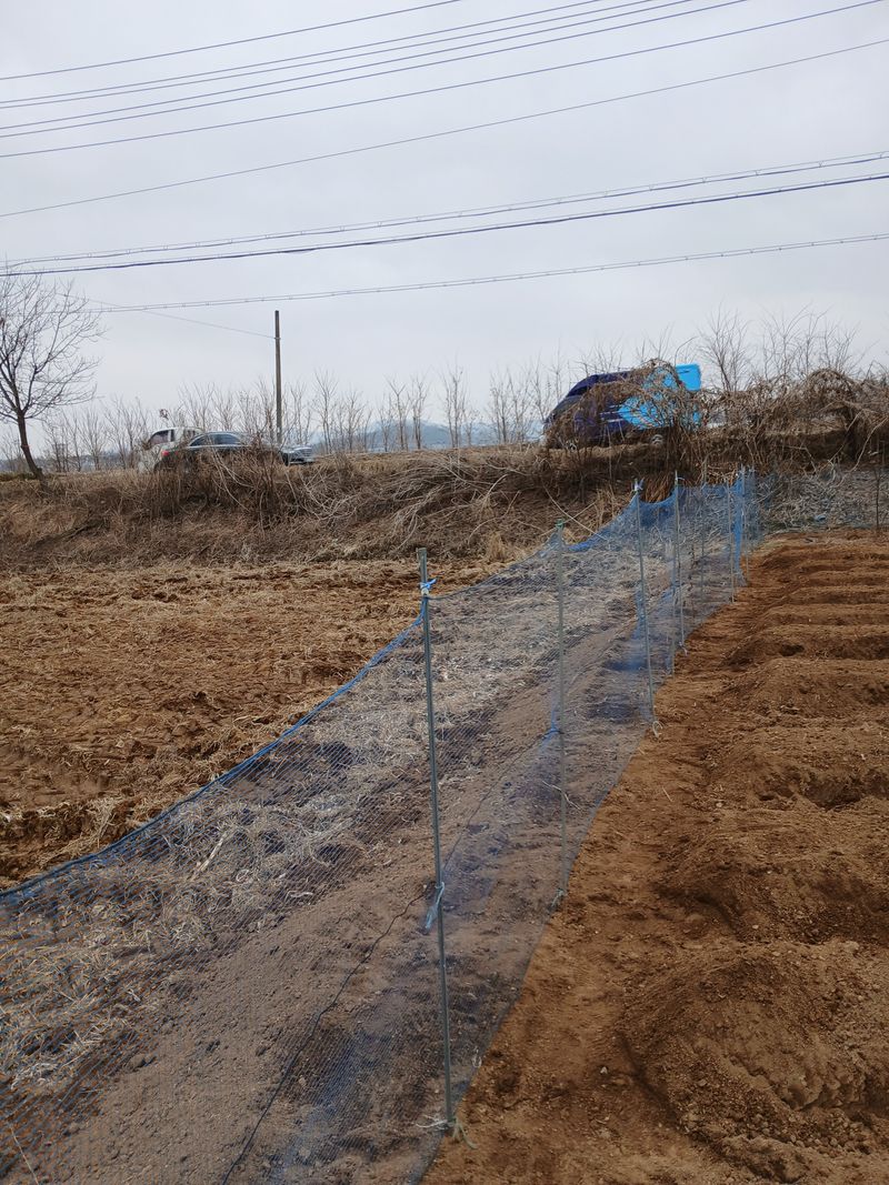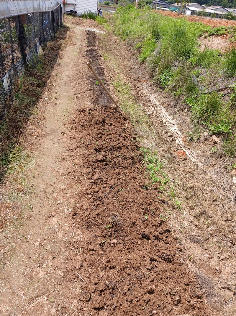 밭 주변 제초제 살포 완두콩 수확후 이랑만들기 토양살충제 , 복합 비료, 유황칼슘 가축분퇴비 1포 살포후 흙 뒤집기