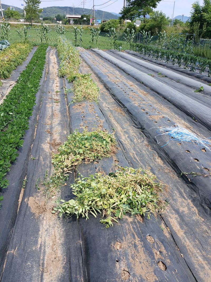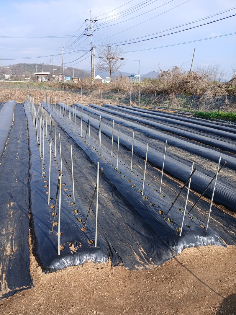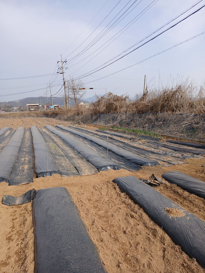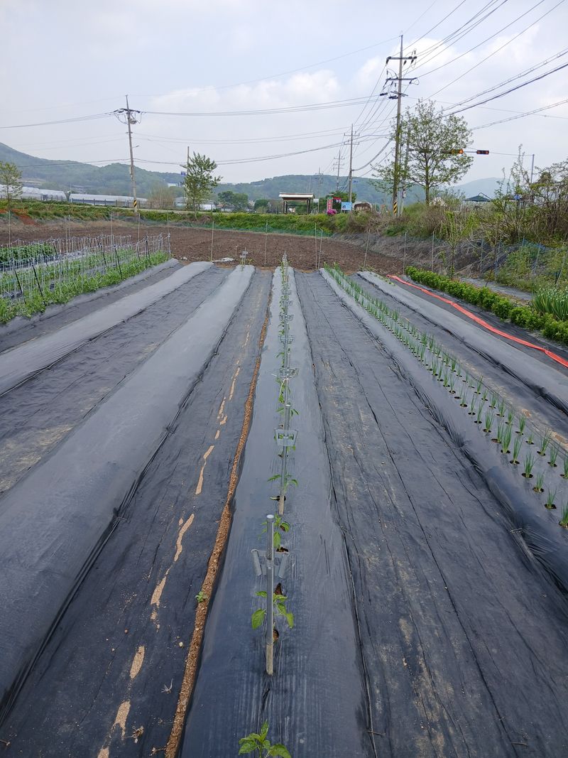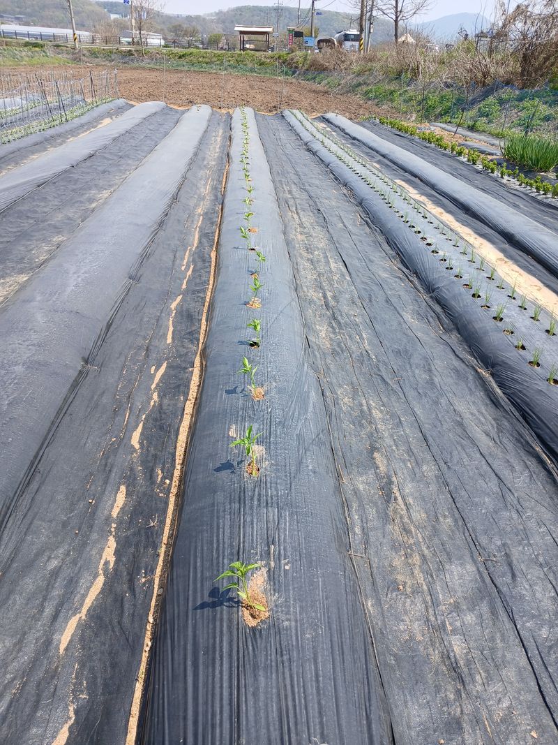 완두콩 과 감자 수확후 퇴비, 복합, 유박, 토양살충제 살포후 비닐멀칭작업 고추 탄저병, 총채벌레, 담배나방 예방살포 밭 주변에 제초제 살포