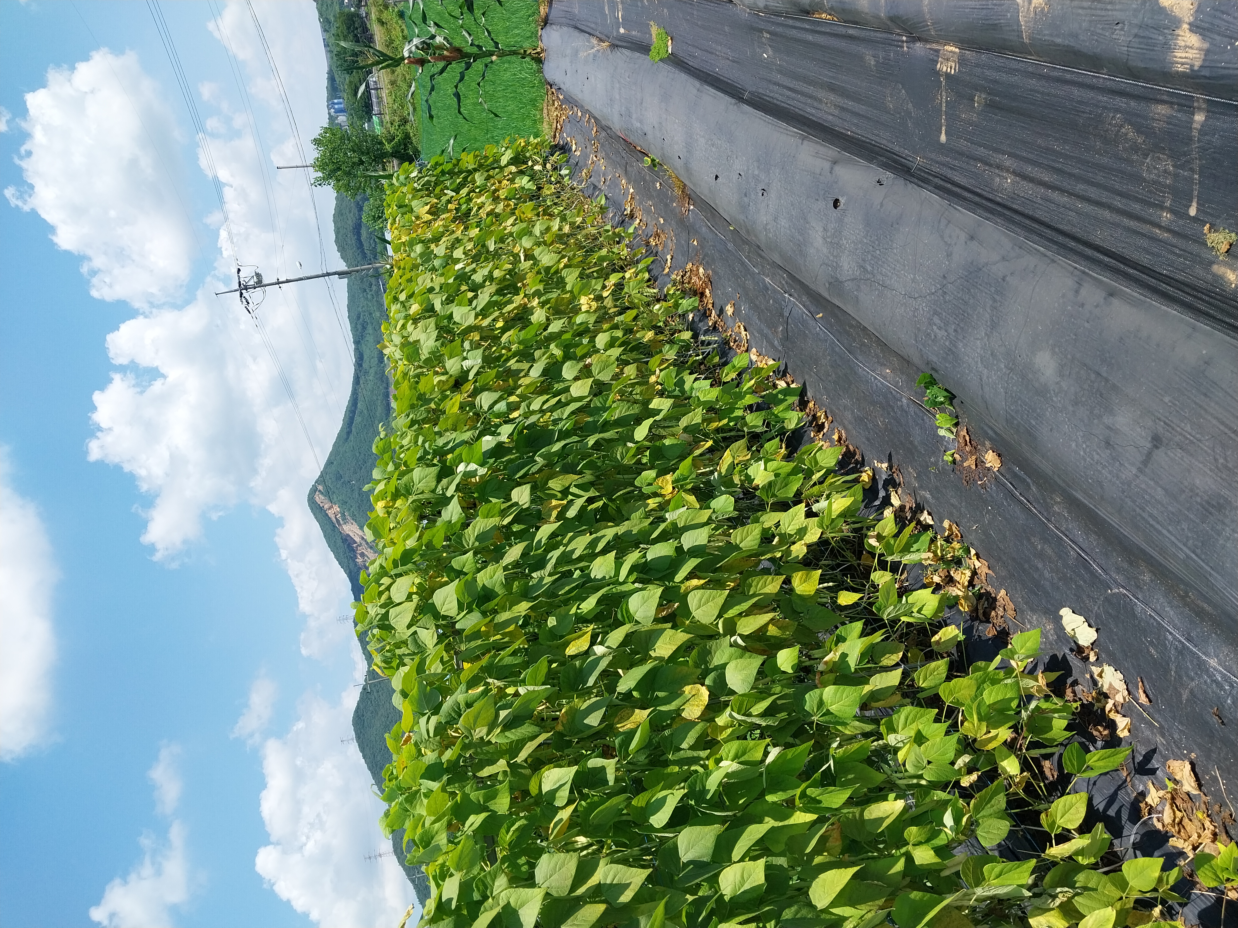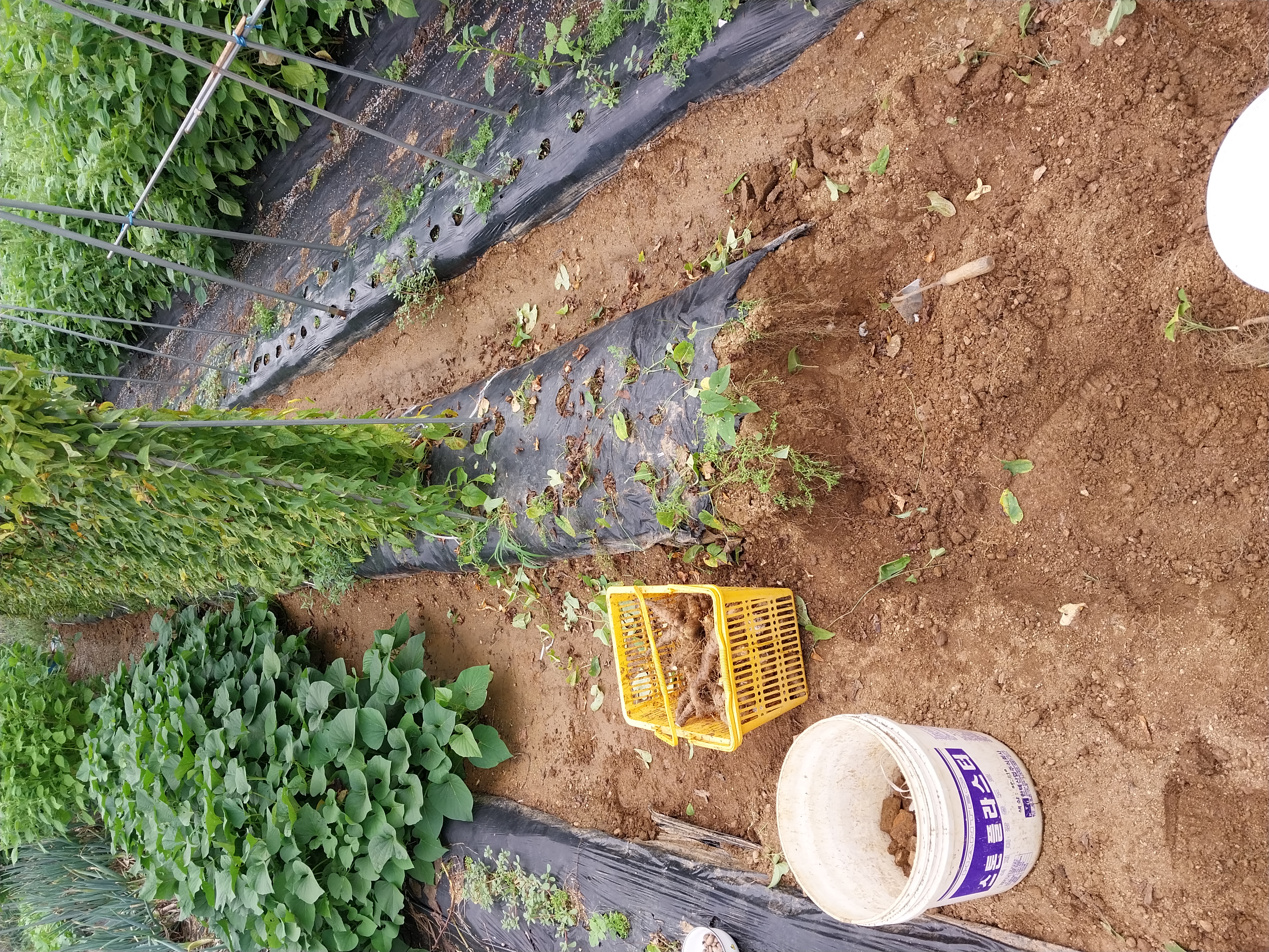 감자 수확이랑 경운작업및 비닐 멀칭작업 참깨 지주설치 호랭이 강낭콩 첫 수확