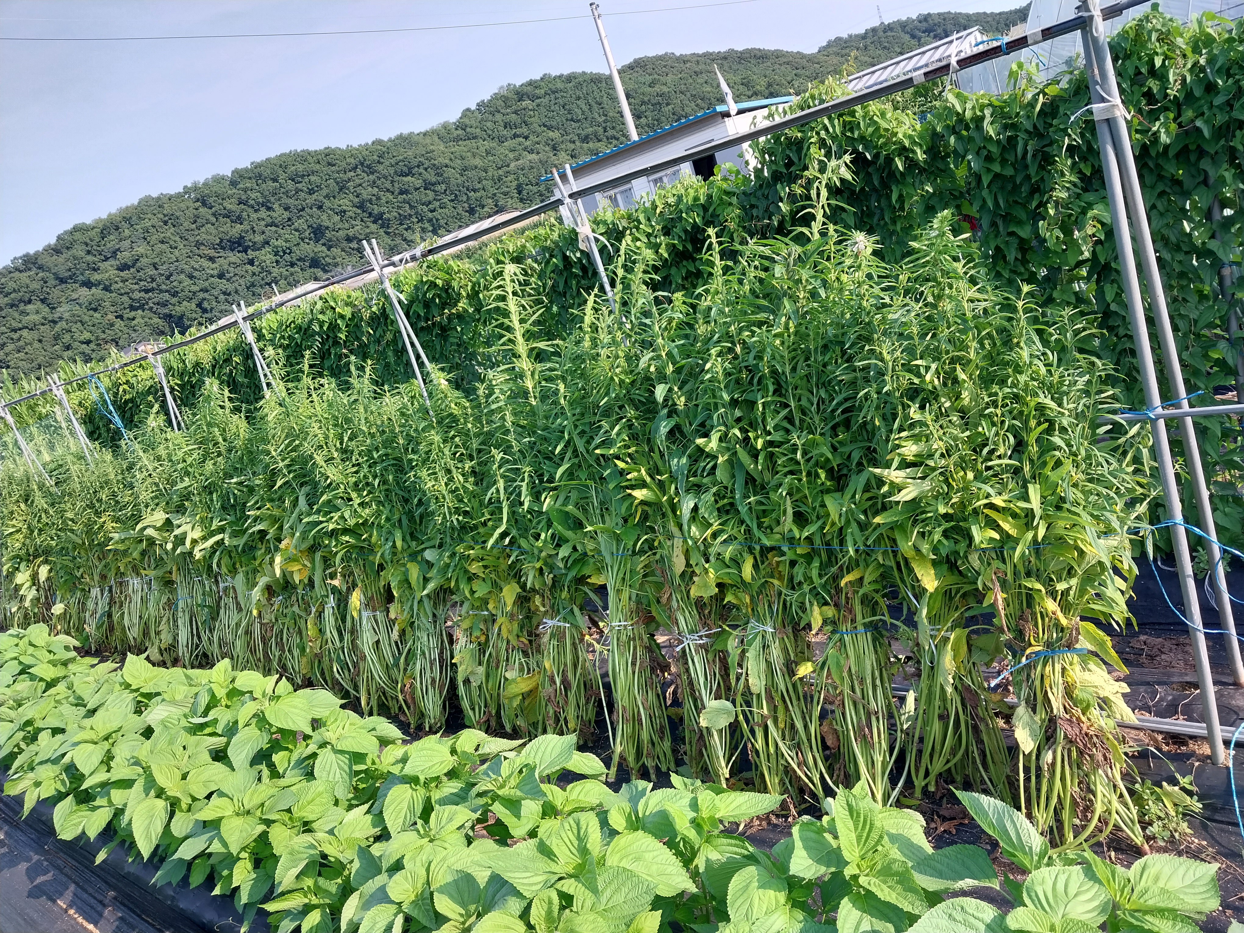 아욱, 상추파종및 들깨 순지르기 고추 꼭지따기및 제초작업 오이, 가지, 녹두 꼬투리 수확