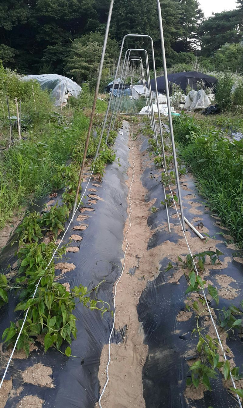 마 넝쿨을 올릴 지줏대 설치작업을 하는중입니다. 해당 작물명이 없어서 임의로 선택했습니다...~
