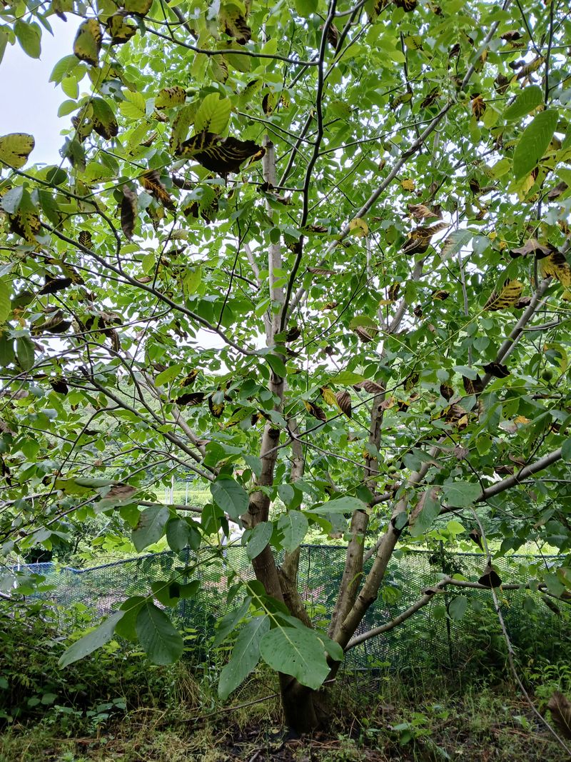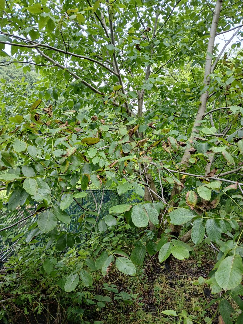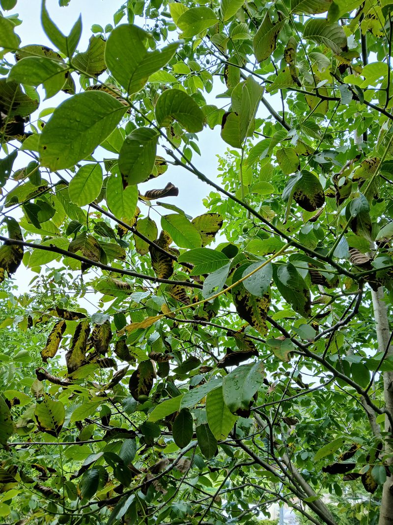호두나무 탄저균 발생으로 살균제 살포하다. 참께.들께 왕잘커 살포하다 들께 순치기하다.