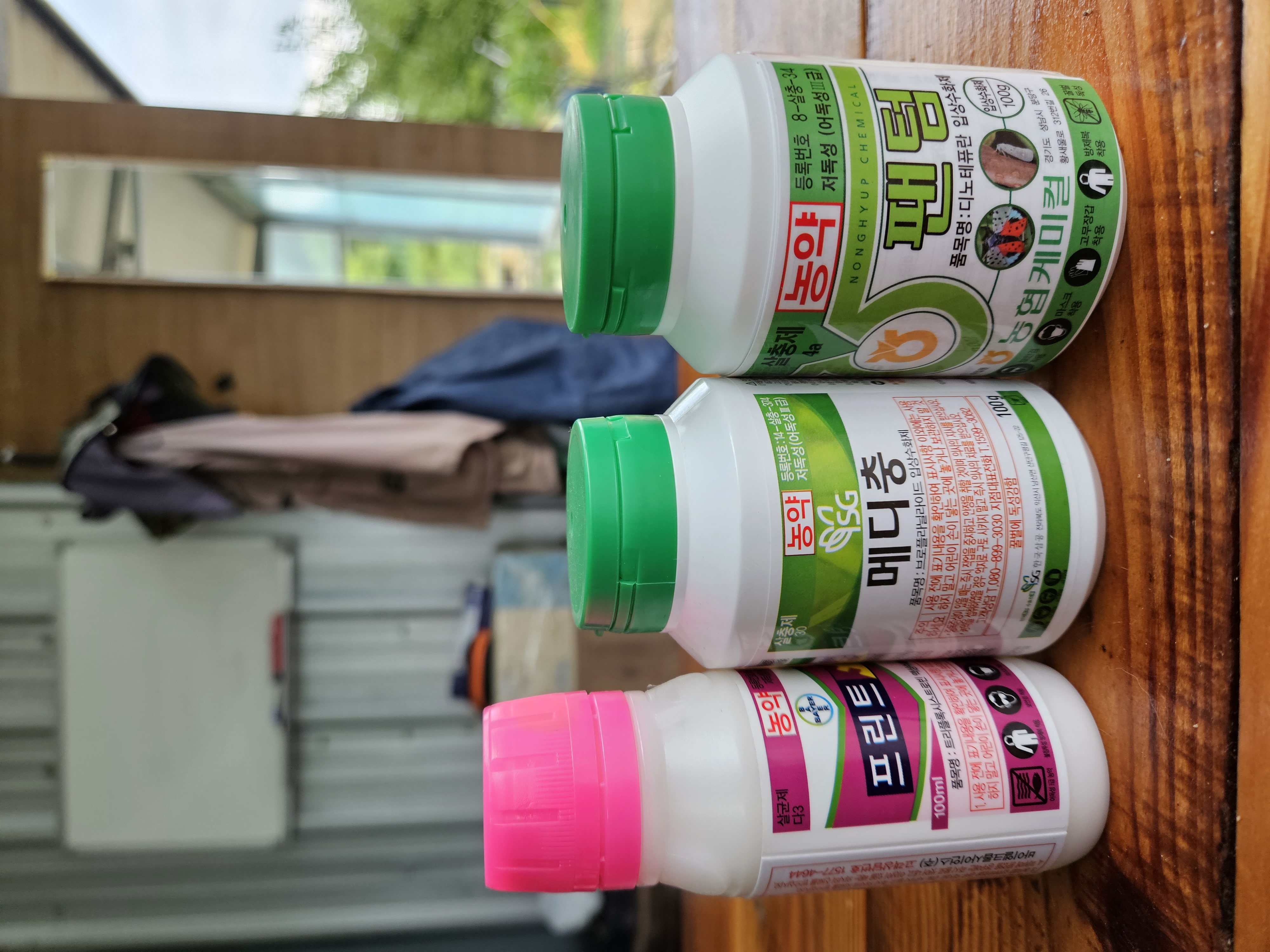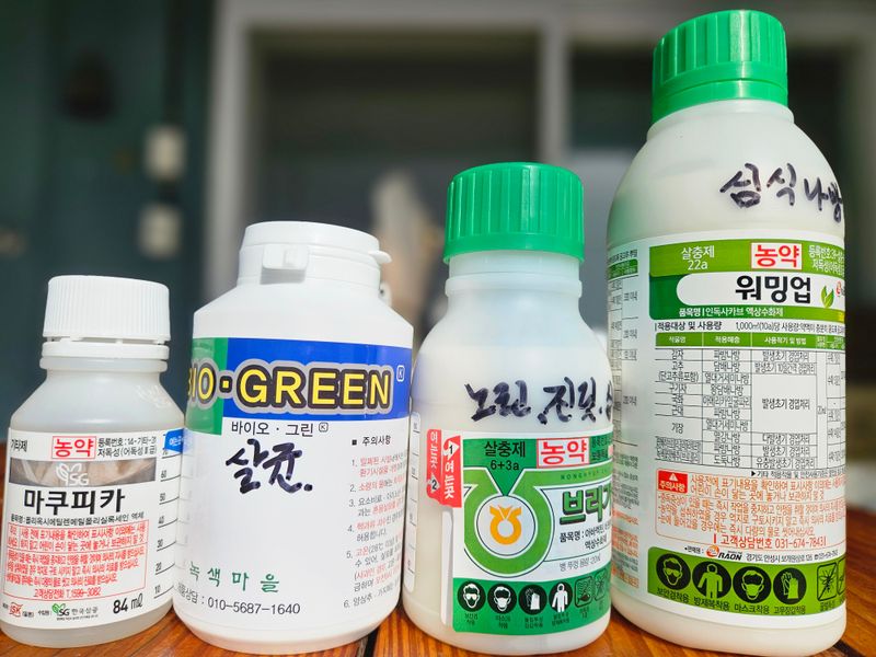 바이오그린3(살균240ml) 브리가드(250ml 혹진딧,심식,노린) 워밍업(500ml 심식나방) 마쿠피카84m 전착제) 물 450리터에 희석하여 살포함