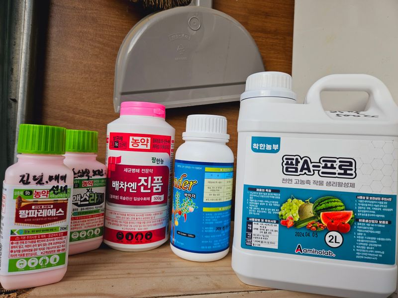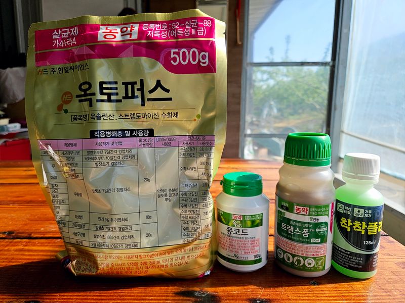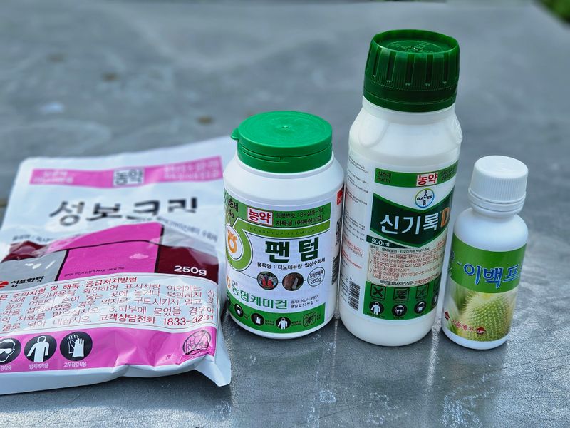성보크린250g(세균구멍) 신기록D500ml(순나방,노린재) 팬텀250g(매미충,총채,깍지) 칼피아-이백프로(확산,습윤,거품제거) 나르겐500g 물450리터에 희석하여 살포