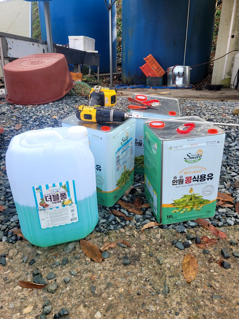 감나무과수원에 감나무가지 동해방지를 위해 500리터용 에스에스기를 이용하여 콩기름과 퐁퐁세제를 혼합하여 유막코팅 작업을 함(에스에스기 3회 - 약 6000평 방제, 인원콩식용유 18리터 3통, 더블퐁주방세제 18리터 중 9리터 사용) 45도의 온도로 1차건조시킨 대봉...