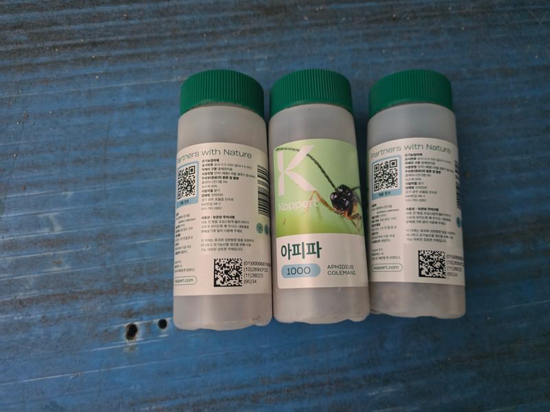 지난주 목요일 월요일 두번방제 진딧물화힉방제 총깍충3병 응칠이1병반 1500리터살포6일후 오늘 콜레마니 6병 투입