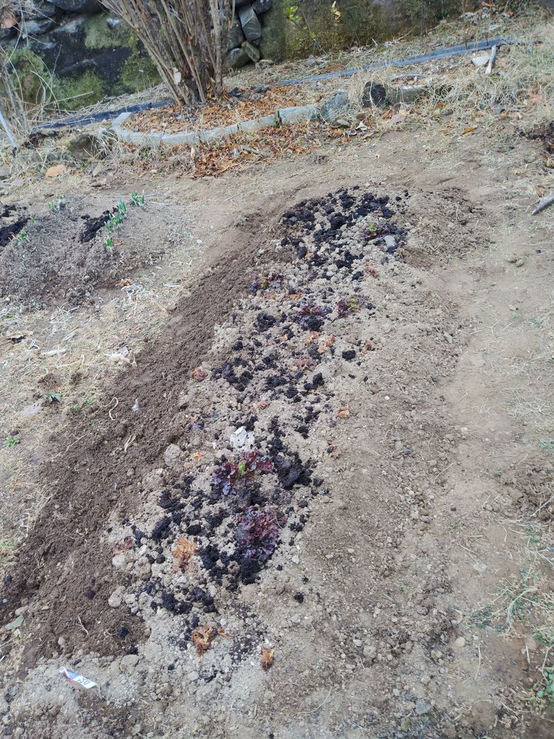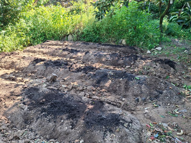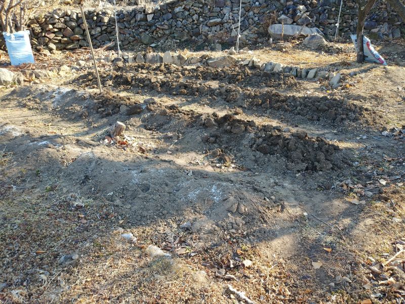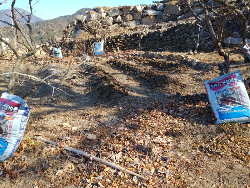 밭만들기. 고추밭 갈무리하고 김장무 심으려고 밭을 일구었다. 퇴비. 복합. 석회. 붕소. 토양살충제를 넣고 일구었다.