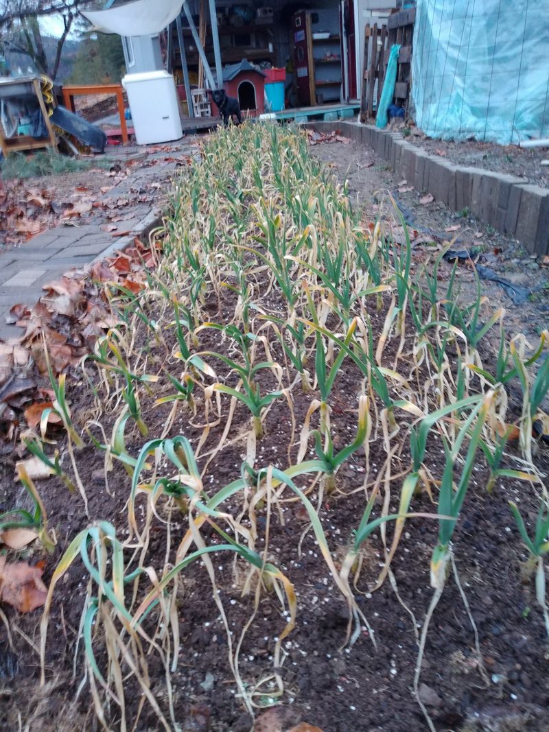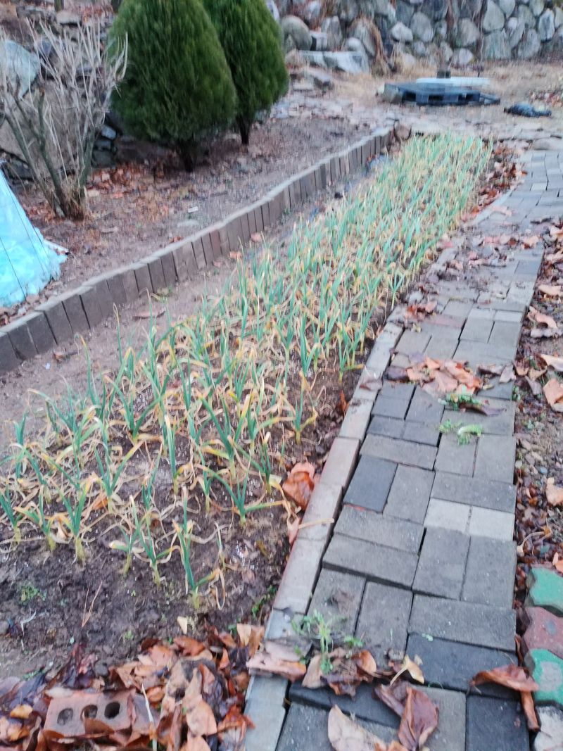 오전 비가 와서 일부 마늘이 쓰러졌다. 흙을 돋우고 바로세우기 작업을 했다.