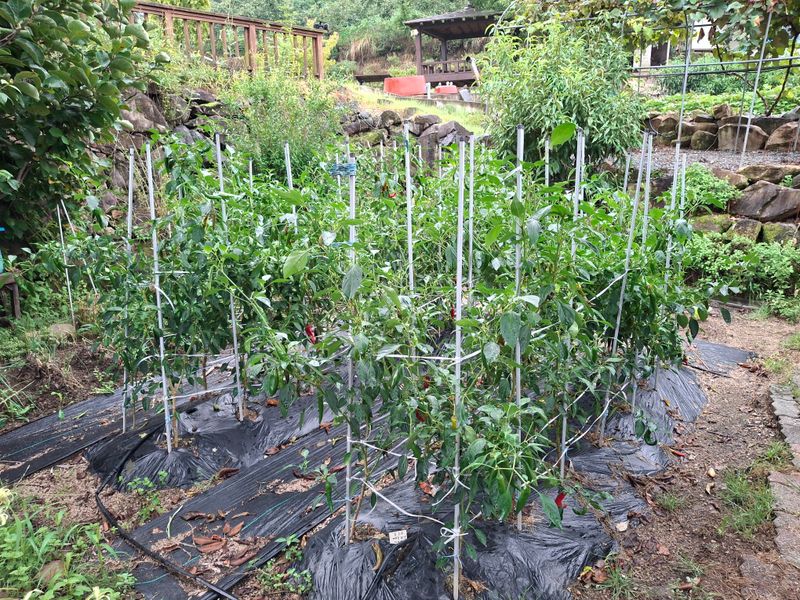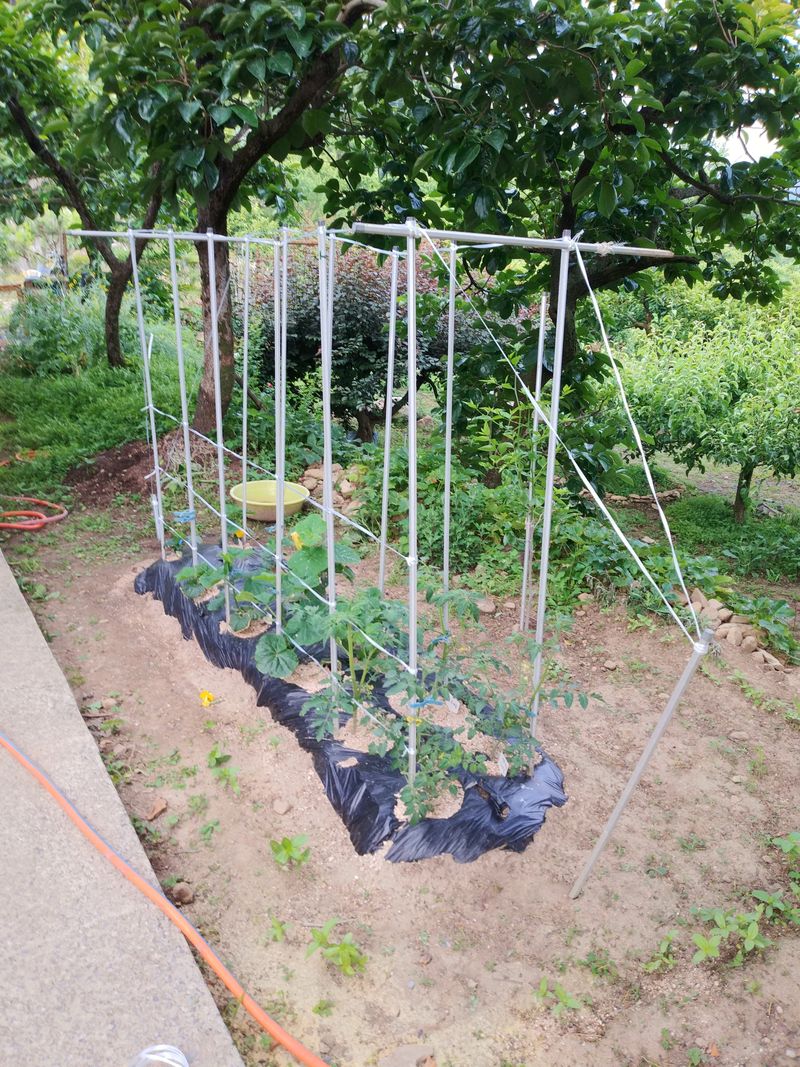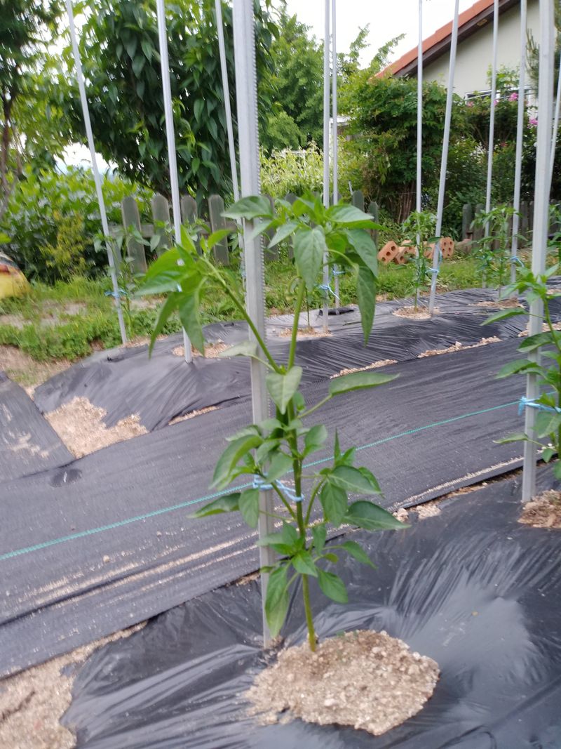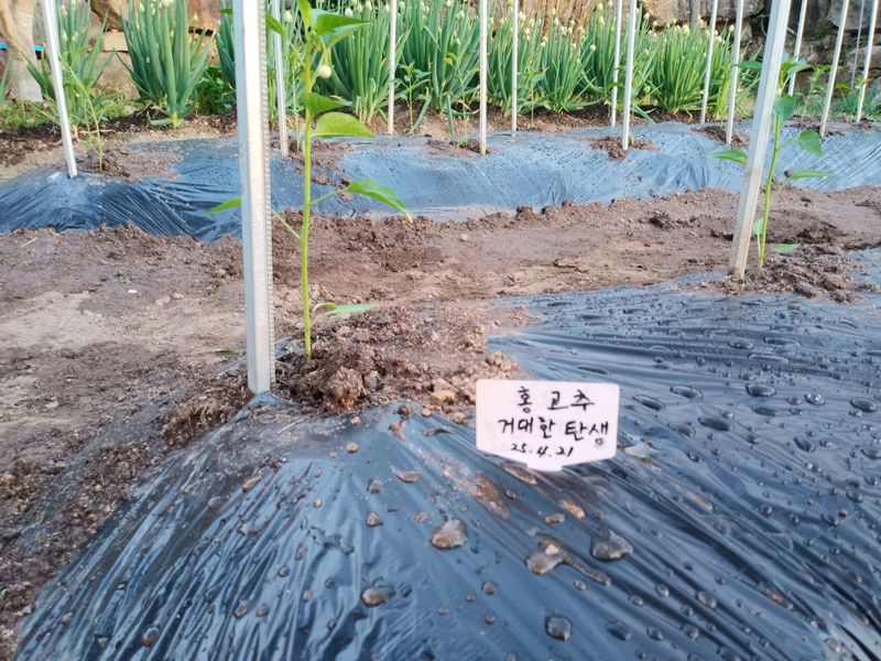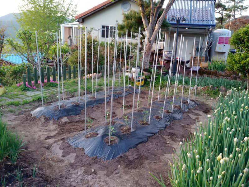 윗텃밭에 고추모종 옮겨 심고 아랫텃밭에 닭걀껍질가루 토양살충제 섞은후 멀칭작업 함.