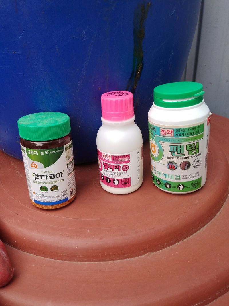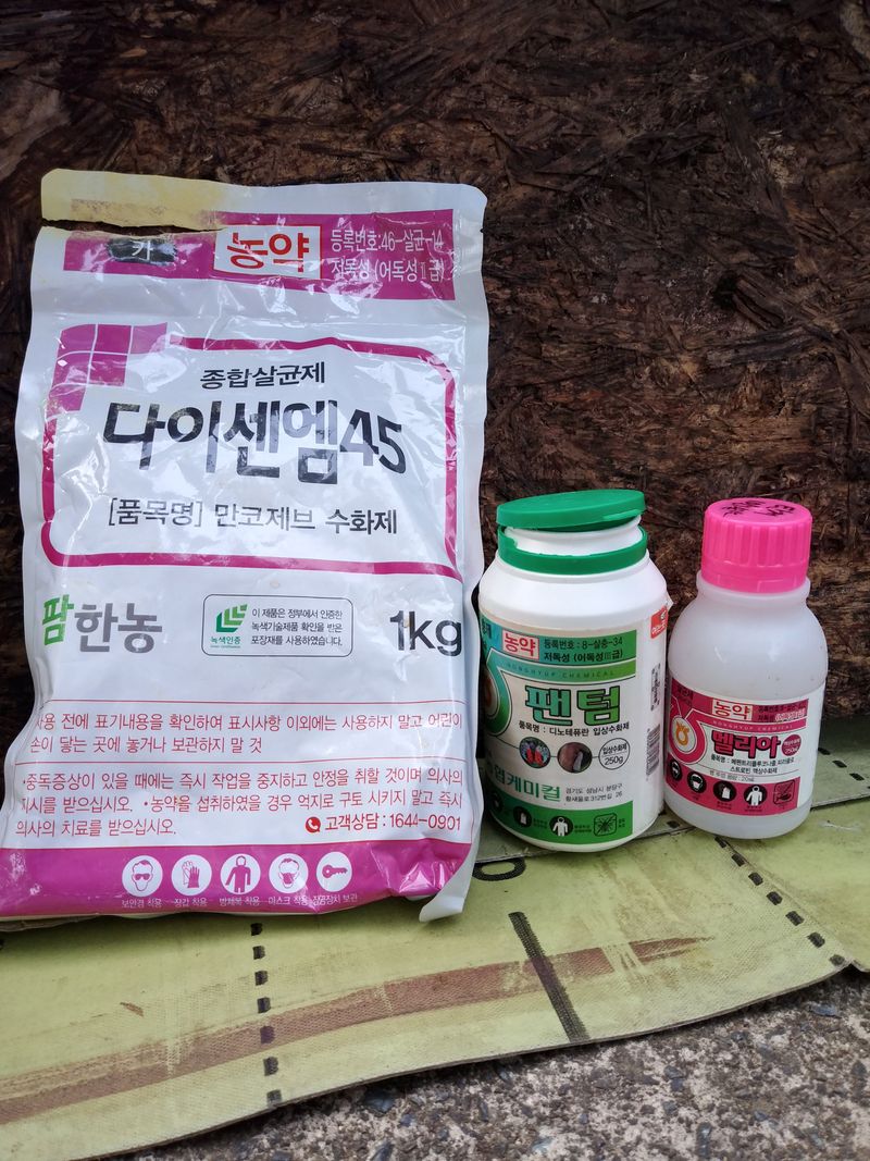 4차 방제작업 실시 06시 다이센엠45. 팬텀(살충제). 멜리아(살균제)와 일부 영양제인 칼슘제. 미량요소 다운겔을 섞어 살포했다. 소금과 요소약간 섞어주고... ㅎ