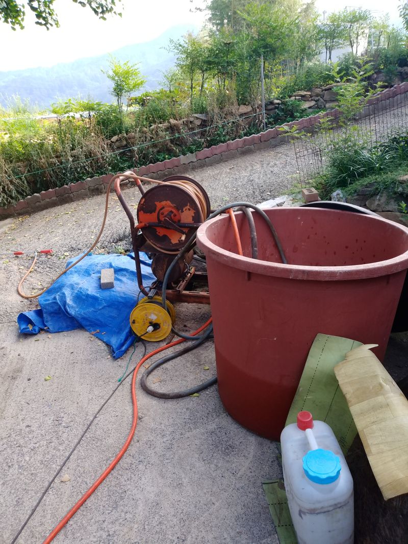 감딴후 앙상한 가지에 잔류한 해충을 구제하려고 마을 작목반이 함께 약을 쳤다. 작목반에서 배포한 신바드와 함께 목초액, 소금을 약간넣어 모타분무기로 뿌려 주었다.