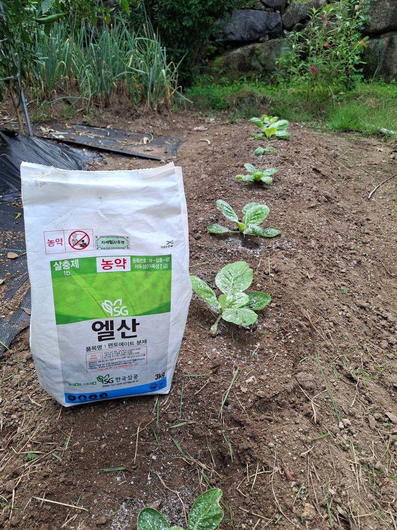 나방벌레, 청벌레를 예방하려고 오신수화제를 배추에 뿌려주었다. 약효가 얼마나 가려나...