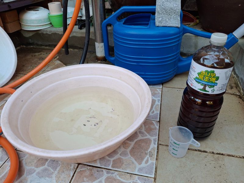 청벌레가 몇마리보이고 배추 잎을 제법 갈가먹어 방재했다. 알타코아와 오신을 함께 넣고 칼슘영양제를 함께 주었다.