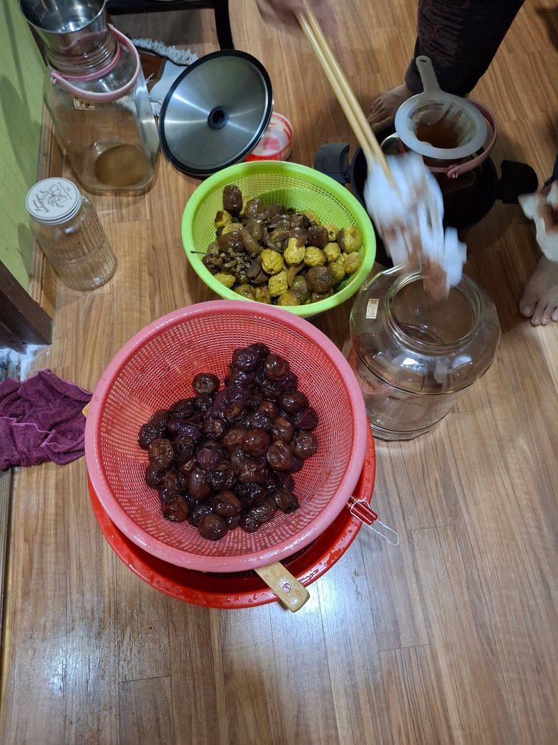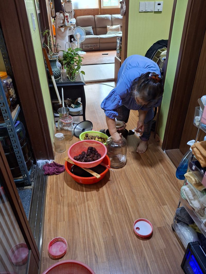 6월중순에 담궈둔 홍매실, 청매실, 돌복숭아, 홍자두 액기스를 백일지나서 걸르기 작업을 하였다. 온천지에 끈적끈적 흘리고 난리도 육이오때 난리는 난리도 아닌..ㅋㅋ