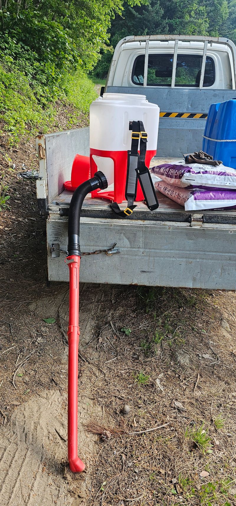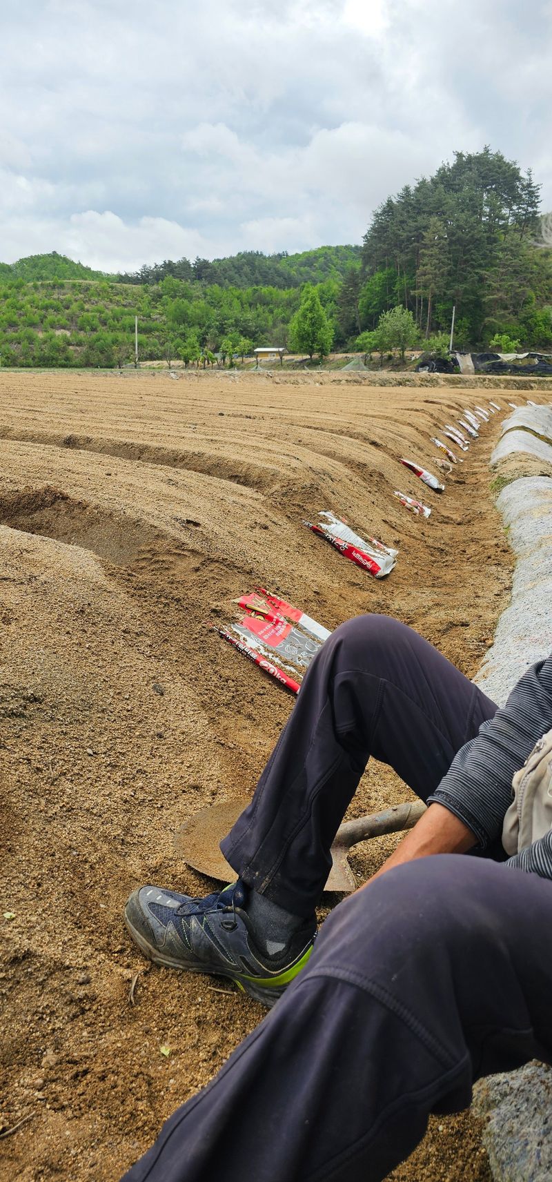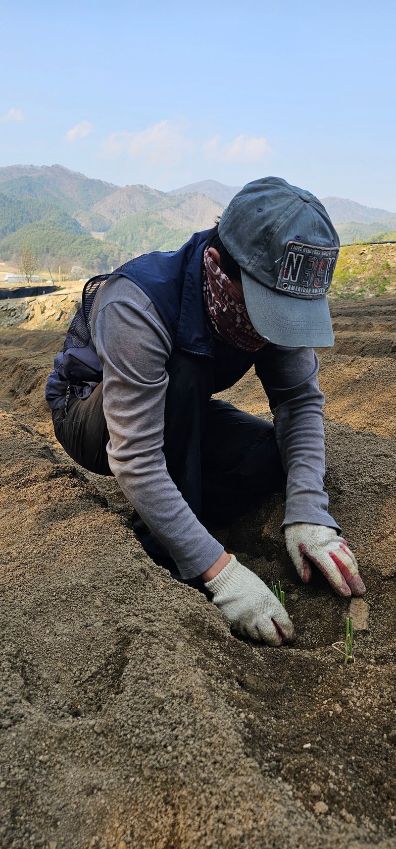 집앞 아래밭 1. 오전: 망 다듬기 및 10만립 캔 약 6통 심었씀. 2. 오후 뒨짓골 당근밭 50미리 pvc 베관 옮기고 배관 고정하고자 말뚝 박음.