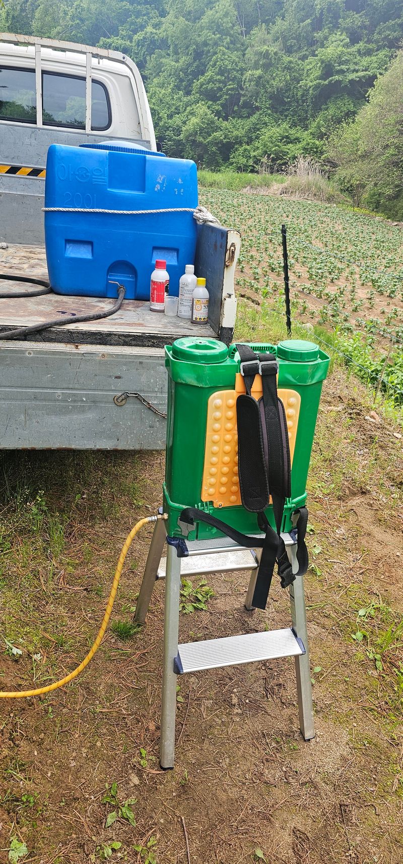 1. 뒨짓골 어제에 이어 제초제 분무중. 2. 집앞 아랫밭 당근밭 제초제 분무중.