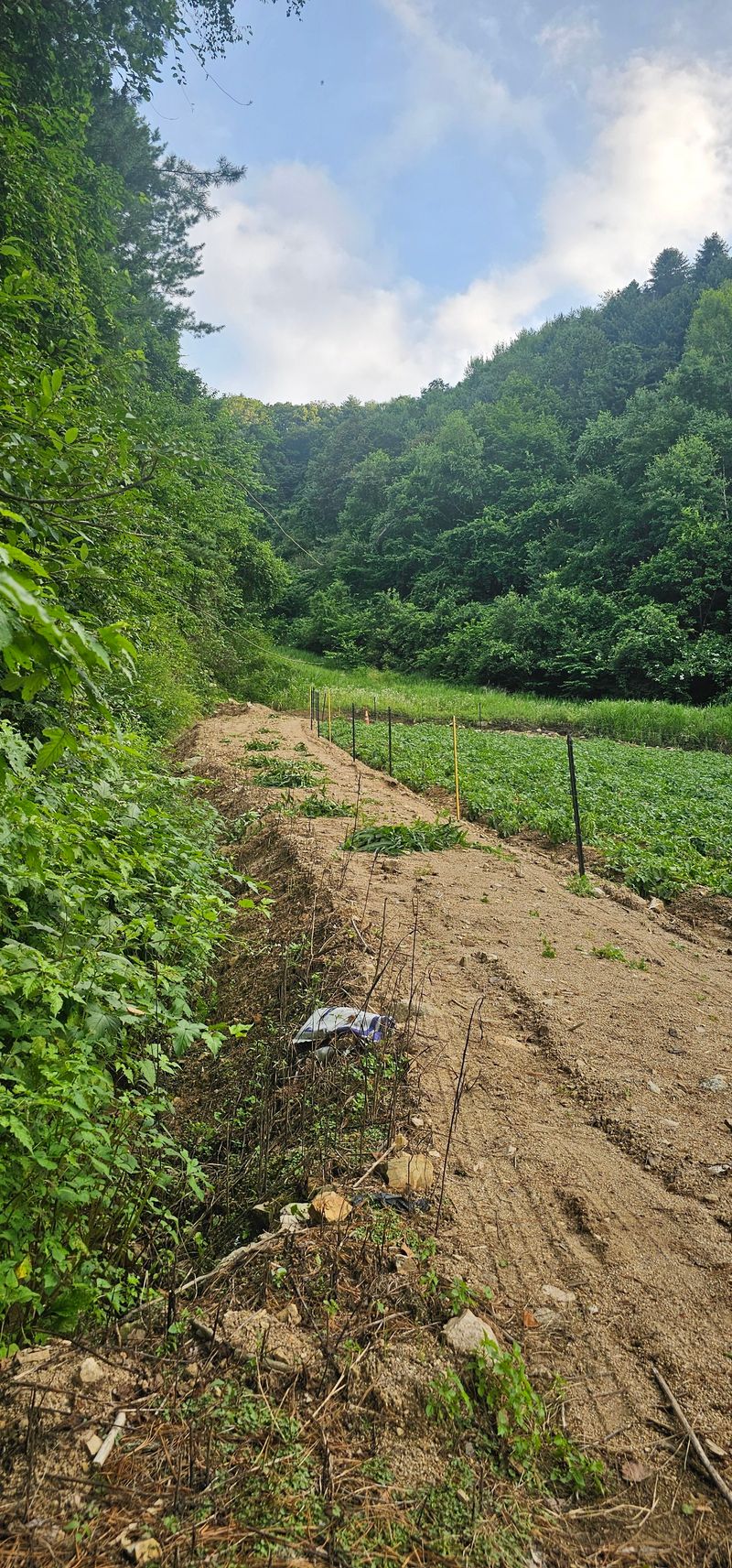 뒨짓골 컨테이너 자리 당근밭 망 보수. * 원인예상: 막혀 있는곳(길가쪽으로 막힌곳 골과 골사이 삽으로 뚫지 않아서 그런지 폭우오듯 온 소나기에 물이 망으로 넘었음)
