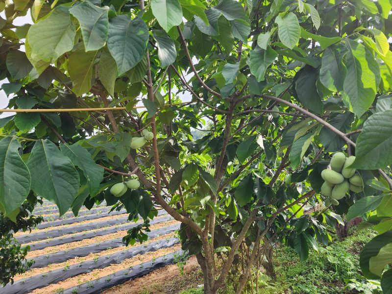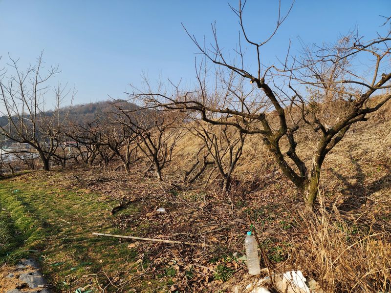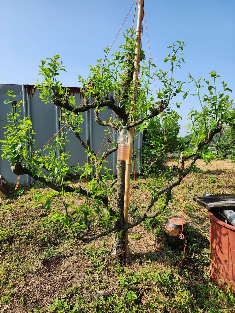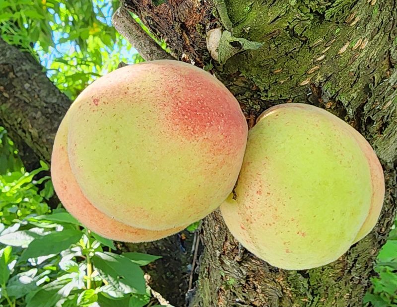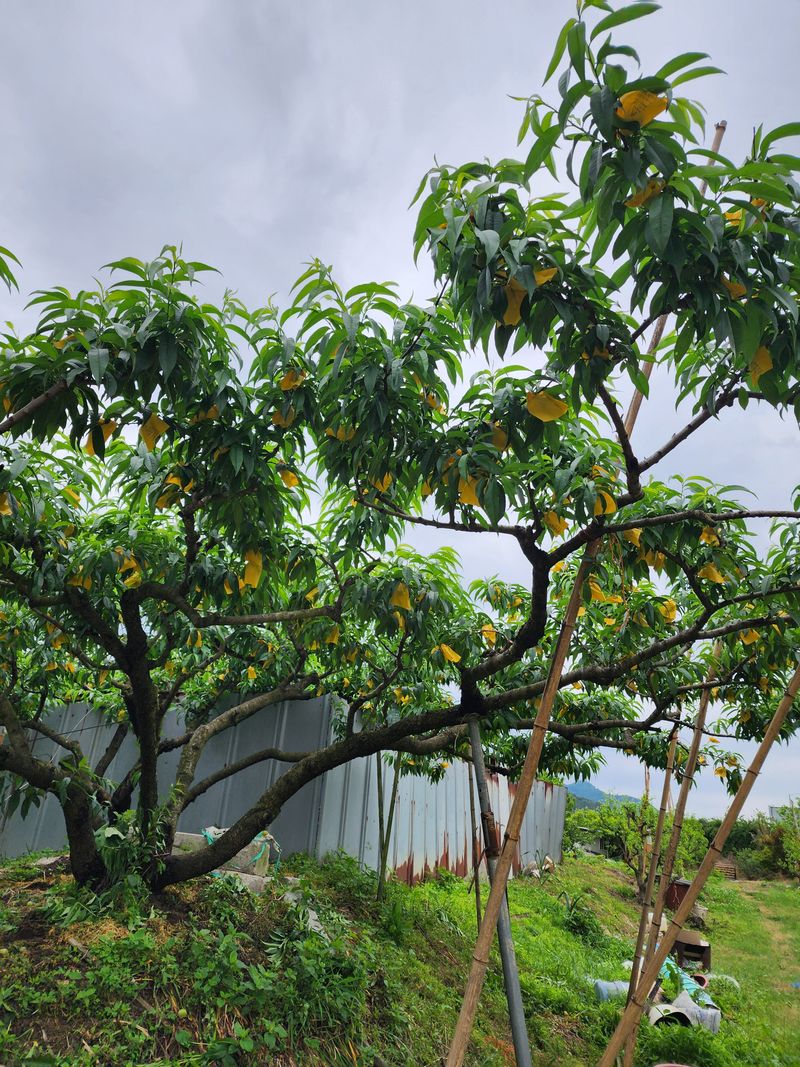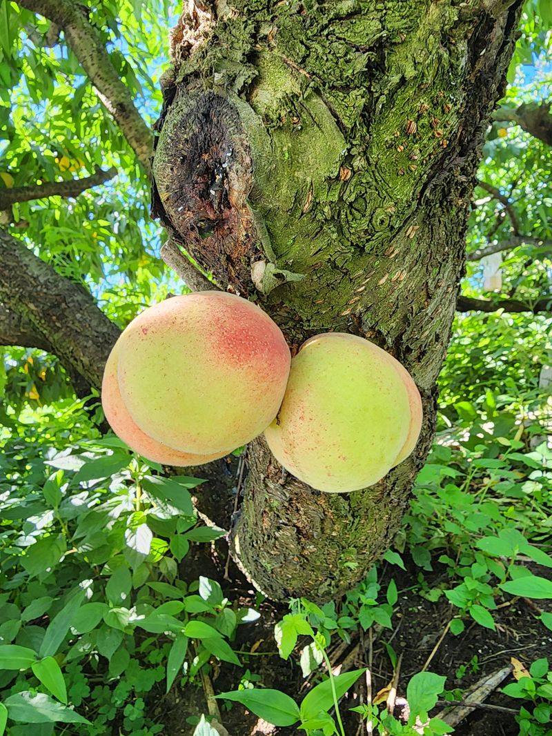 복숭아 수확하였는데 아래둥치에 2개 달린것이 익었네요, 크지 않을거라 생각했었는데 익어서 수확하였읍니다, (수령 30년)