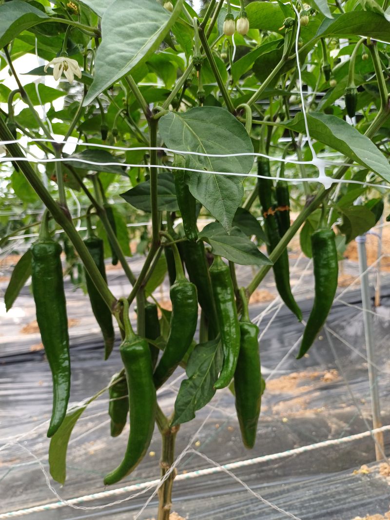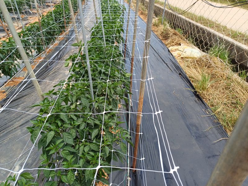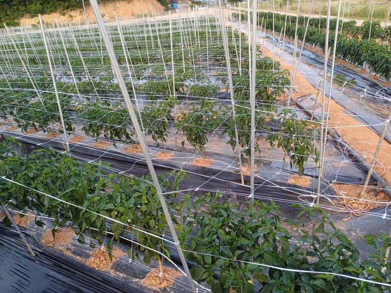 고추망치기 고추줄대신에 고추망을 쳤습니다. 처음 인건비와 자재비는 조금 더 들어가지만 다음번부터는 쉽게 칠수있습니다. 그리고 미리 한단계 더 칠 경우에는 조류피해(씨앗빼먹음)를 최소화 할 수 있습니다.
