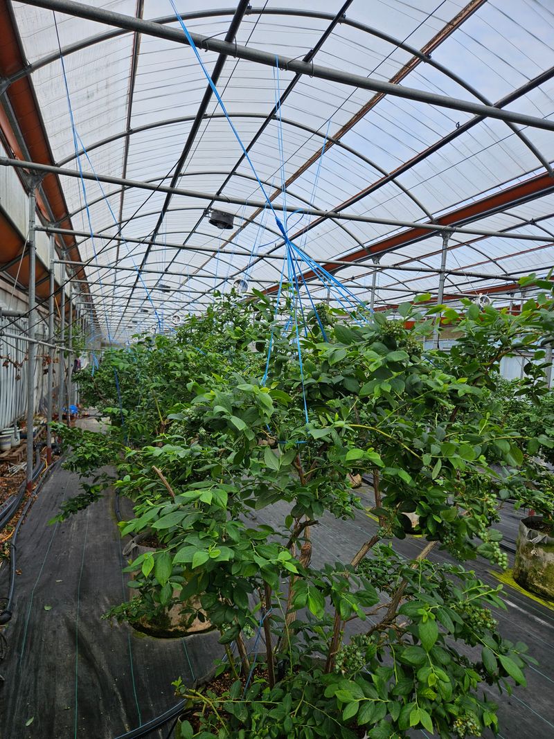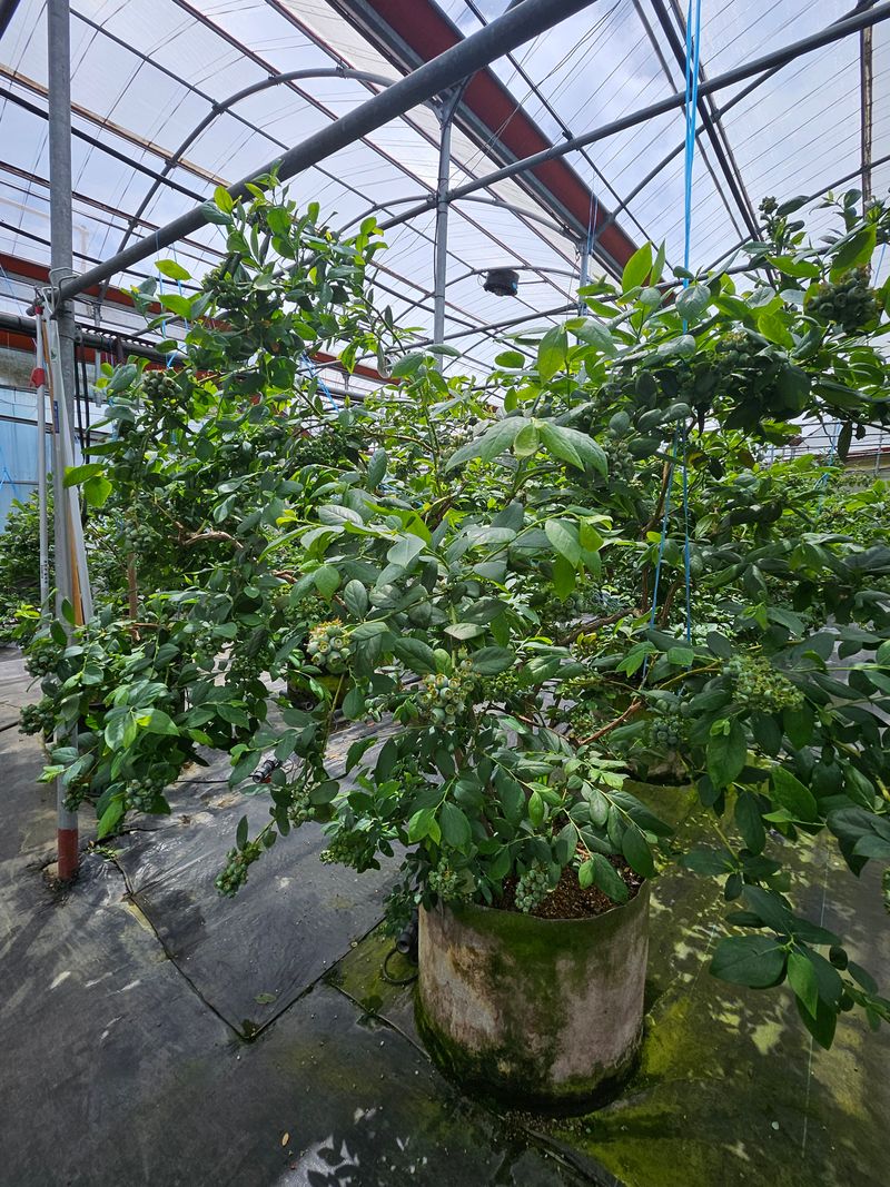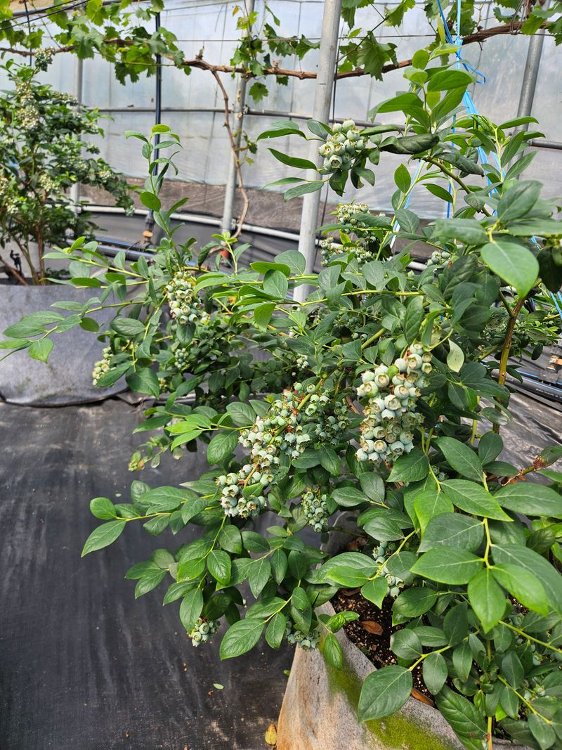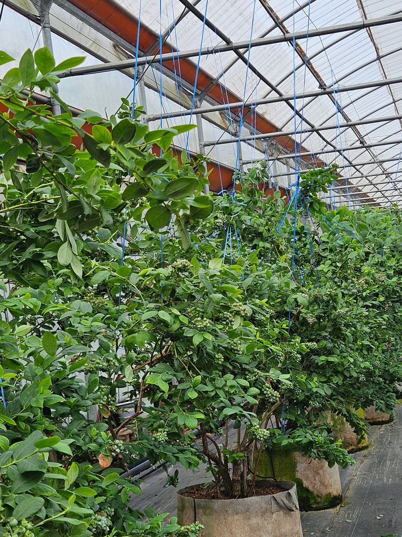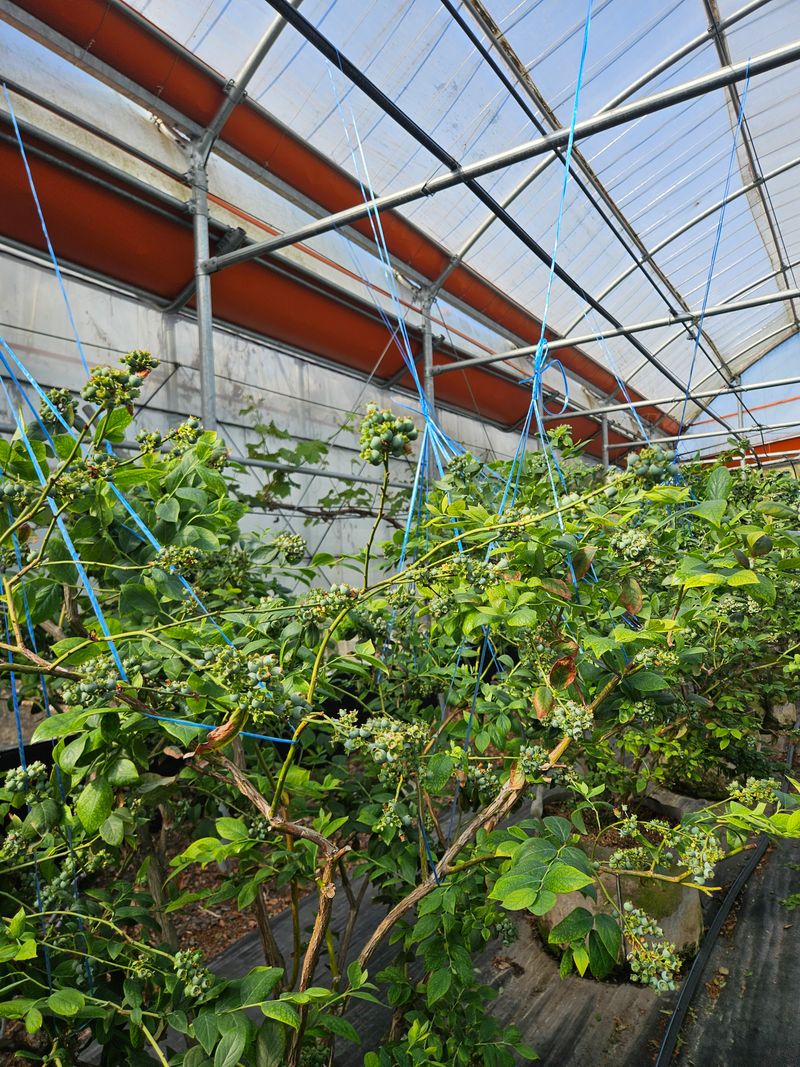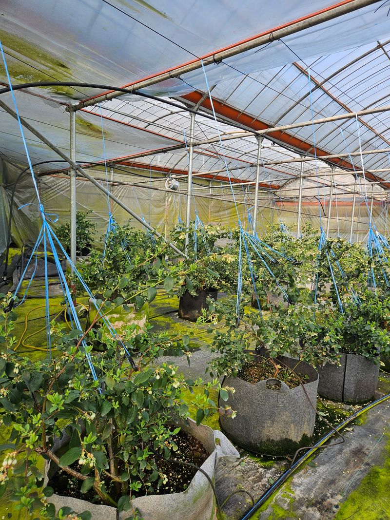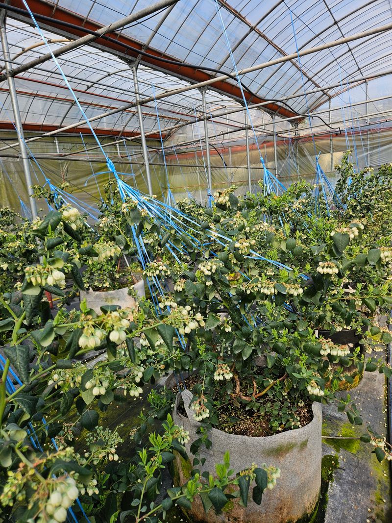 블루베리 꽃적과하면서 늘어진가지 매달다 하우스안온도가30도를 오르내리니 너무더워 나왔어요