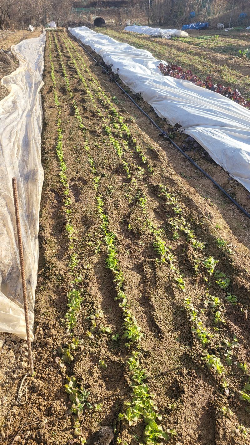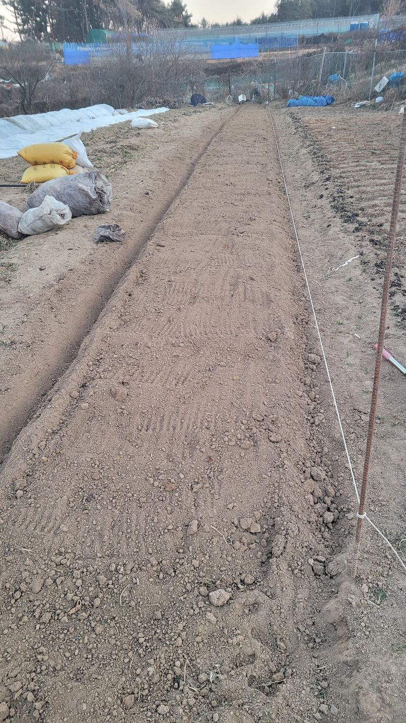 1,28일 석회석과 용성인비 뿌리고 로타리한곳 우분과 문전옥답뿌리고 로타리후 잎들깨 직파 한고랑 마치고 롤링을 끝내고 부직포 덥다