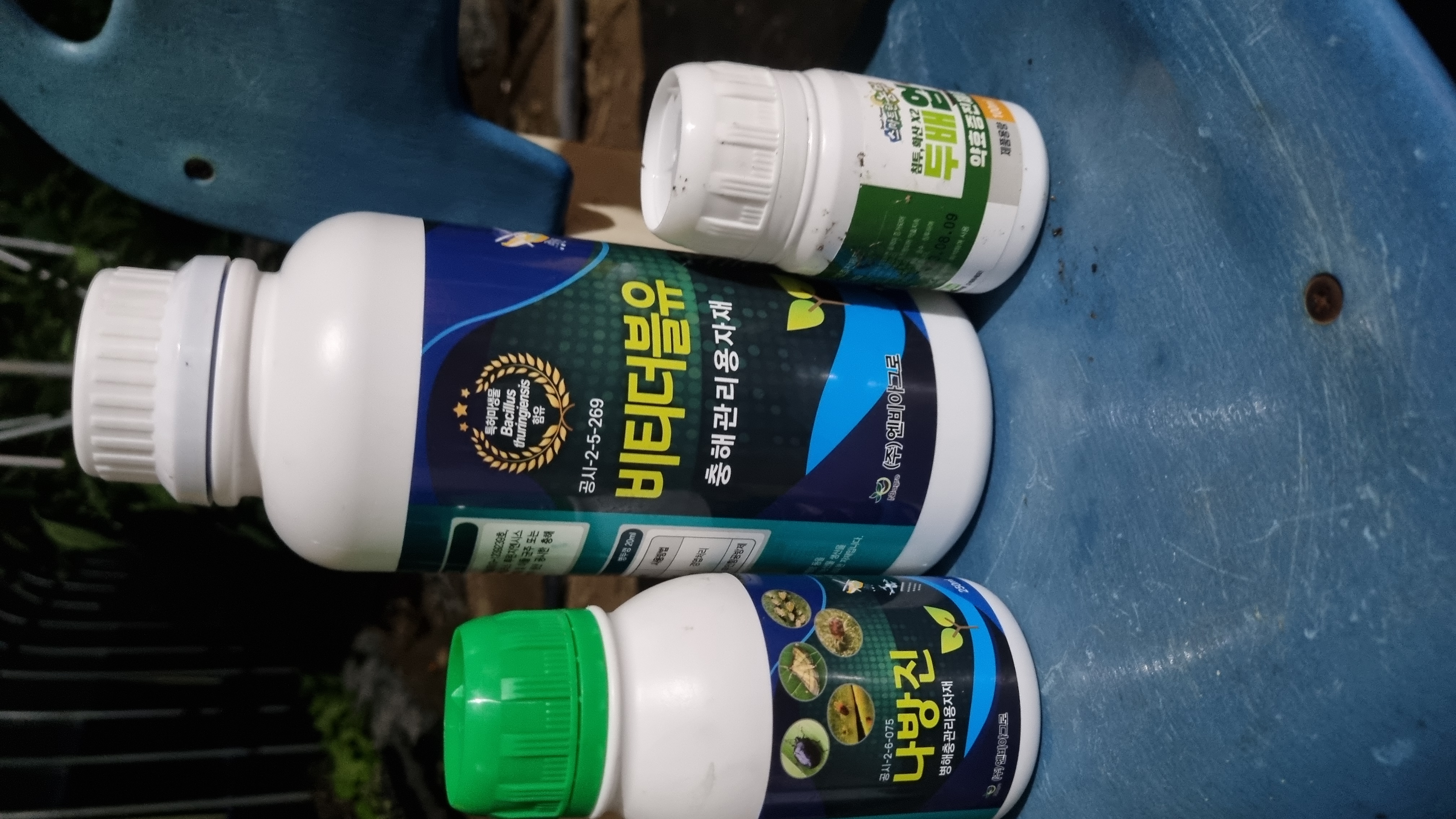 흡비력. 코자입. 기폭제.점적 관수 해주고 방충탄 유기농 코자입 회석해서 엽면살포 작업 실시했읍