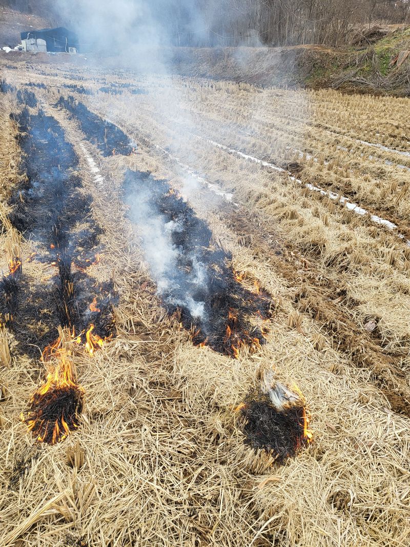오늘 오전8시경 논으로 출근하는데 날싸가 쌀쌀 해요 논에 볏짚을 태어고 오후에 라면으로 점심식사를 했어요 올해난 농사를 짓게 ㄷ히기를 기도합니다 🙏
