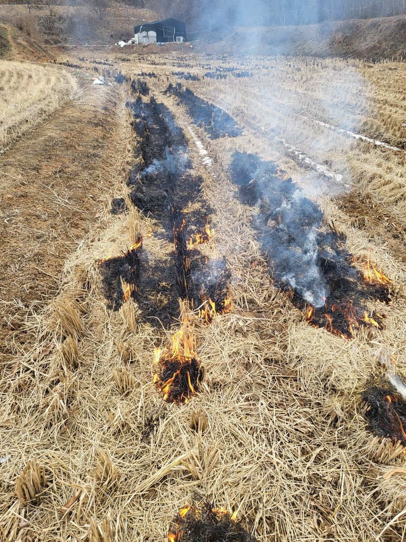 오늘 9시경 논에 출근하는데 날씨가 엄청 춥내요 논에 거칠은 벼를 벤자리에 몇군데 불놓았어요 감사합니당