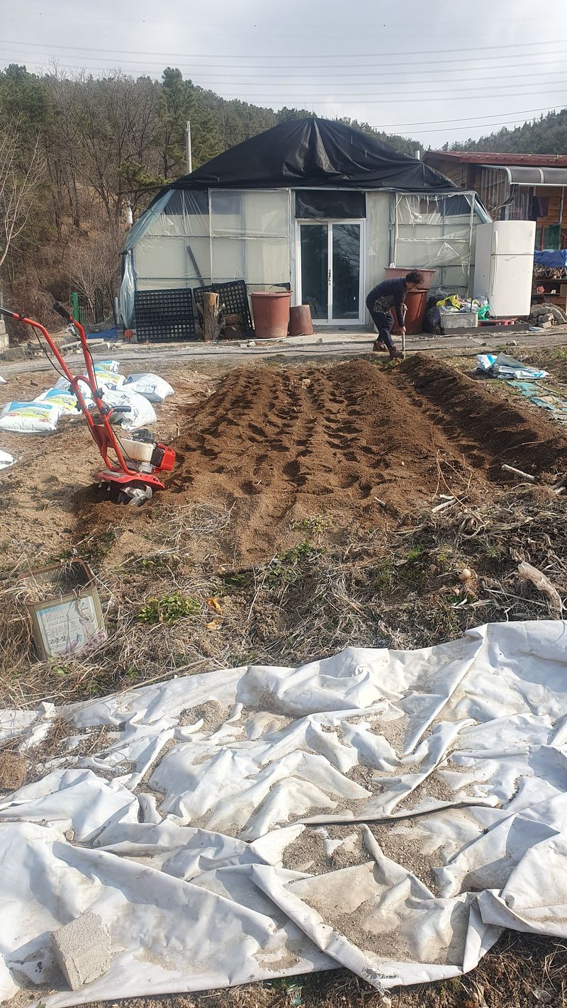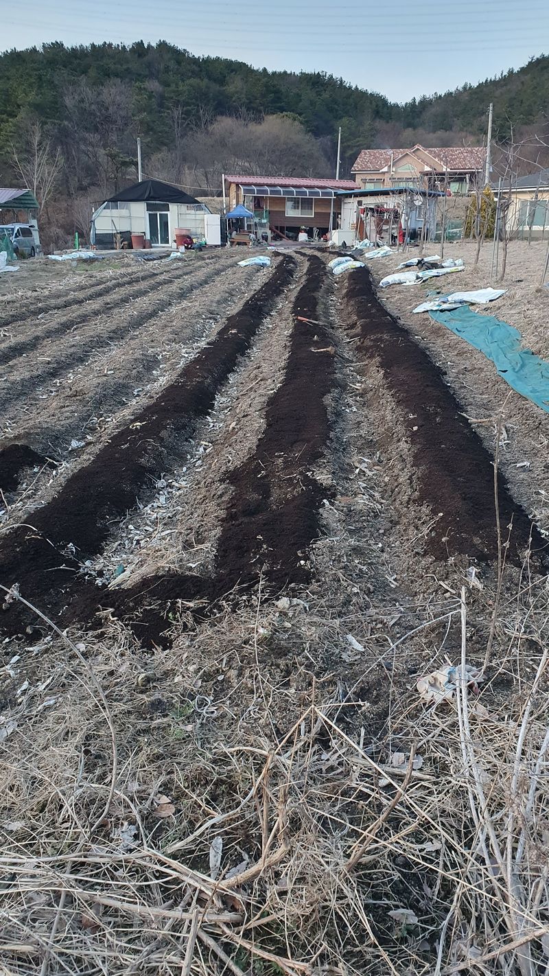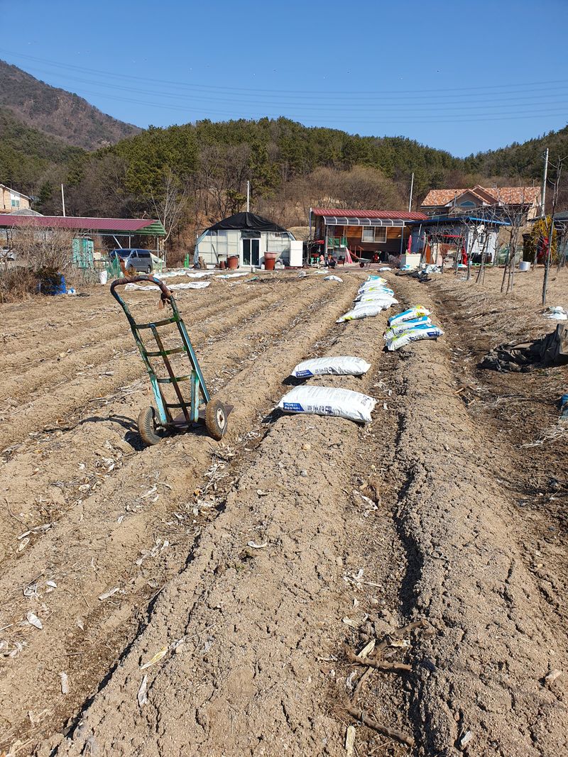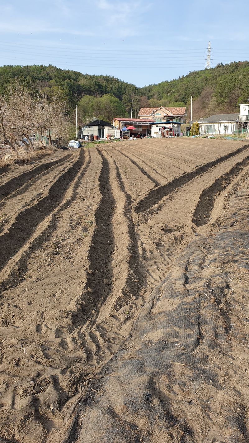 지난주 로타리 치고 가축분퇴비 뿌리고 토양살충제 뿌리고 감자파종하다