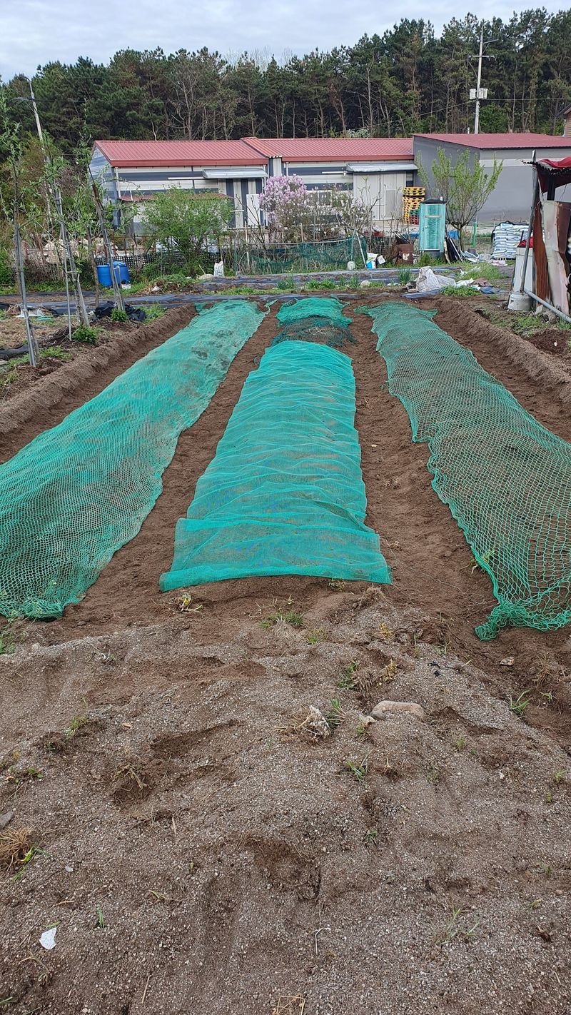 땅콩씨 파종 비둘기,까치가 파종한 씨를 파헤쳐서 파먹어요 피해를 막기위해 망을 씌워 주었어요