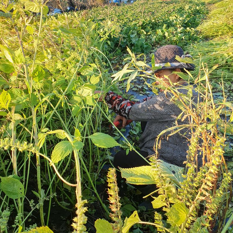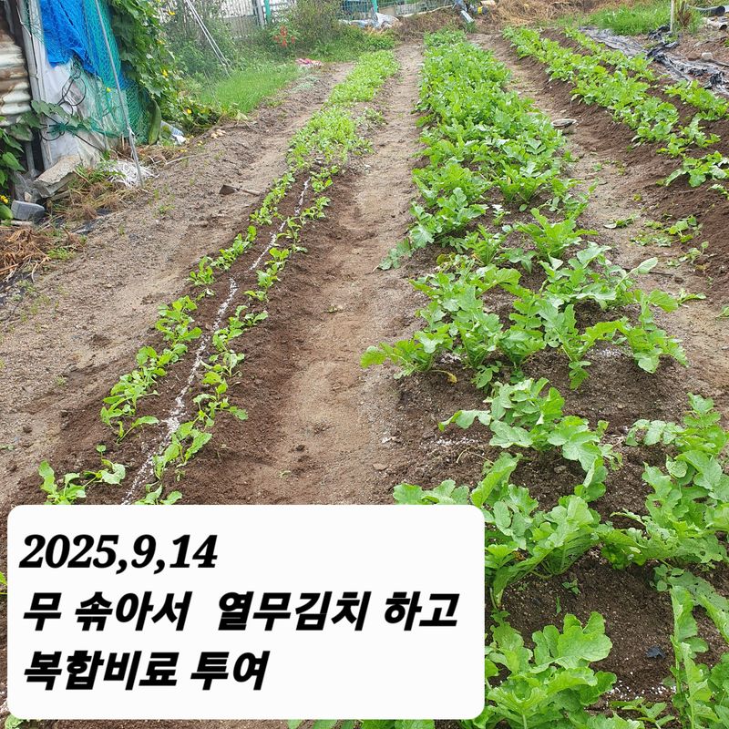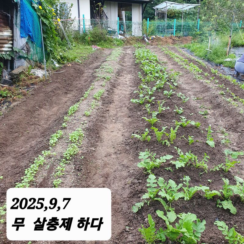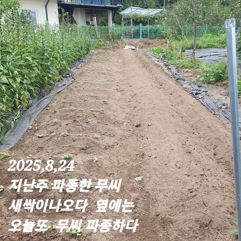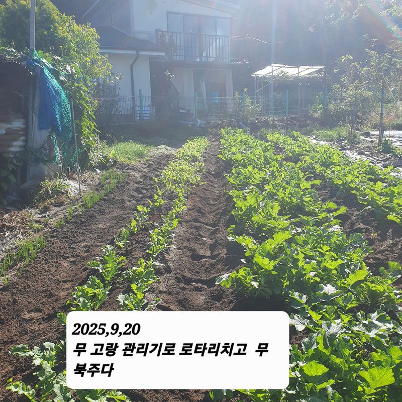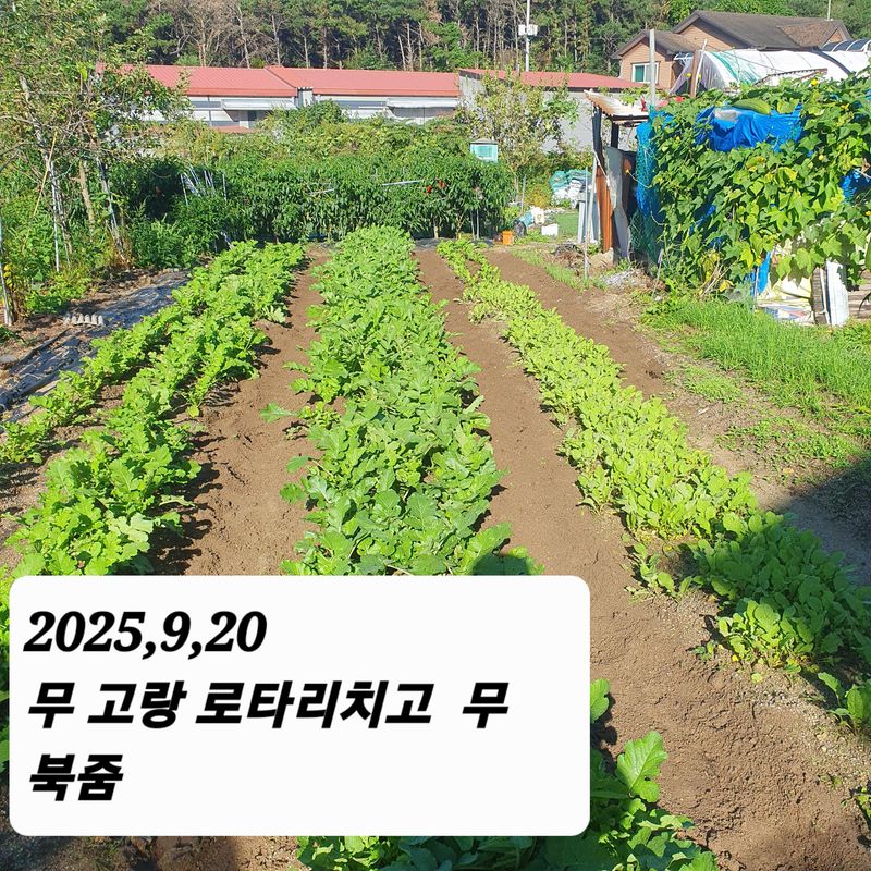 무 씨파종 솎아주고 무고랑 로타리치고 흙 북돋아주었음