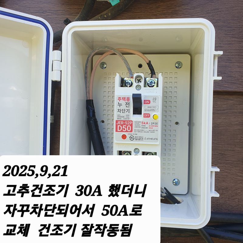고추건조기가 자주 전기가 차단되서 알아보니 30A라서 그런다고 50A로 교체하니 잘작동되네요 💥내년 미나리수확을 위해 제초작업