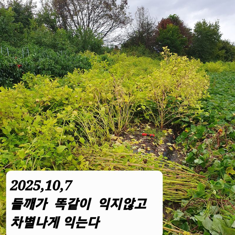 연휴기간에 비가 계속되는 동안 비가멈출때 들깨를 전동가위로 절단 근디 같은날 심었는데 익는시기가 달라 절단작업 하다가 중지 하루사이에 들깨잎이 변하는것 같아 내일로 미루다 오늘도 힘들게 하루를 마무리 하다
