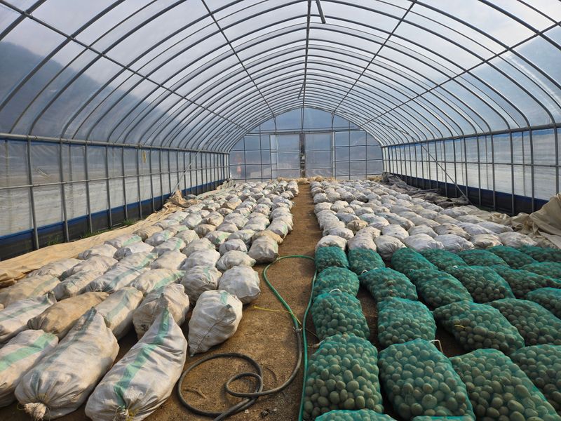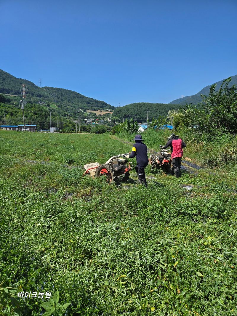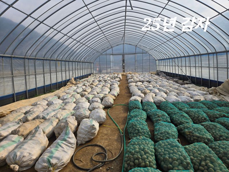 감자밭 로터리 작업중 입니다 오늘은 7천평 로터리 쳤어요 하루 말려서 골 켭니다 하우스에는 감자종자 싹틔우고 있어요 내일부터 종자 절단작업 합니다
