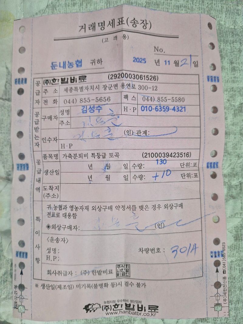 한밭비료(토곡특등급) 130포(덤10포) 수령