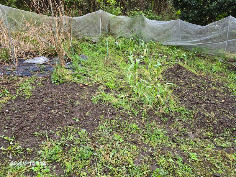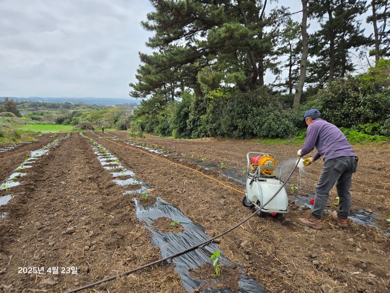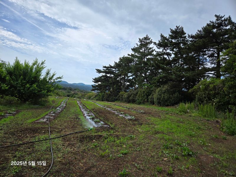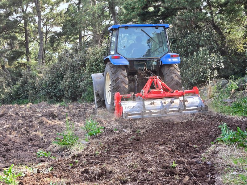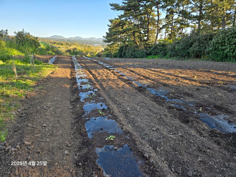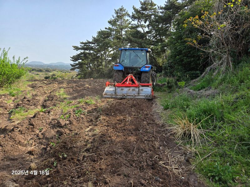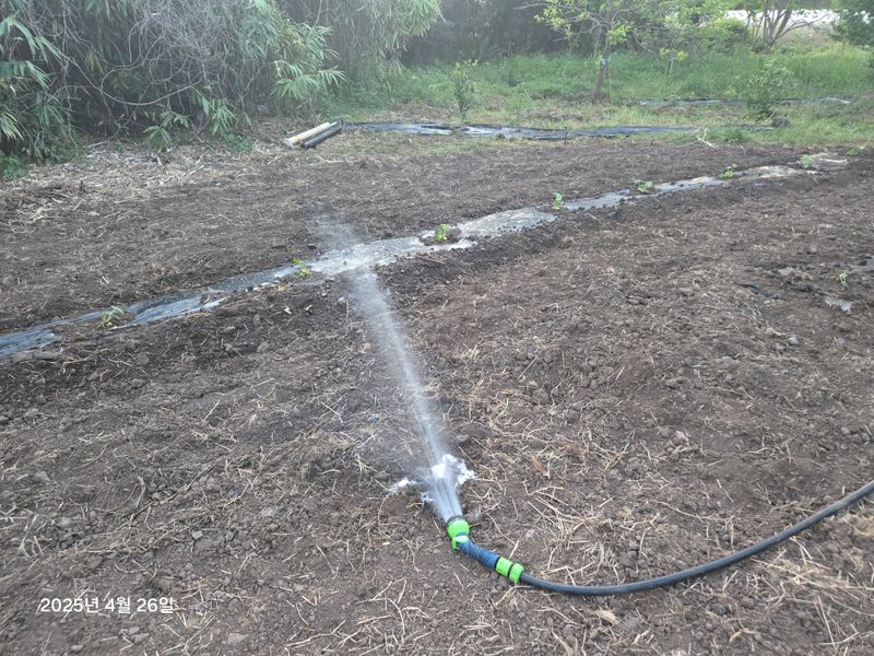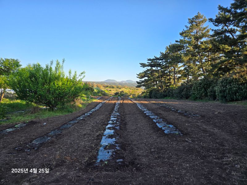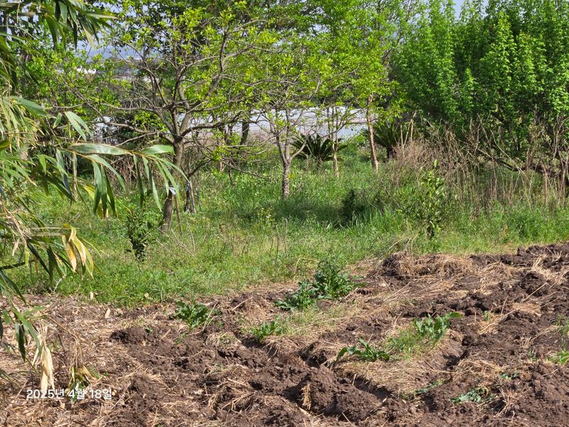 밭 갈고, 로터리 치기 완료 지난 식목일 조천읍사무소에서 나눠준 묘목-석류나무 세 그루, 매실나무와 무화과나무, 3년생 감귤나무에 물주기, 땅드룹 체취, 잡초제거...