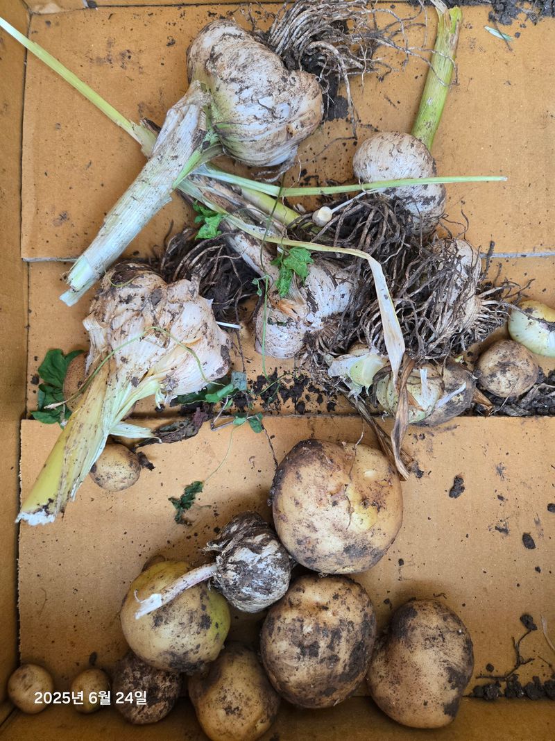 탓밭에 감자 수확. 코끼리마늘도 수확을 했습니다. 아웃둘과 단호박을 나누었습나다. 호박은 신촌 밭 800평에 가득 심었는데 수확이 많았으몀 좋겠습니다. 농사 초보자에기 선물로 심어준 수박과 참외도 기대됩니다.
