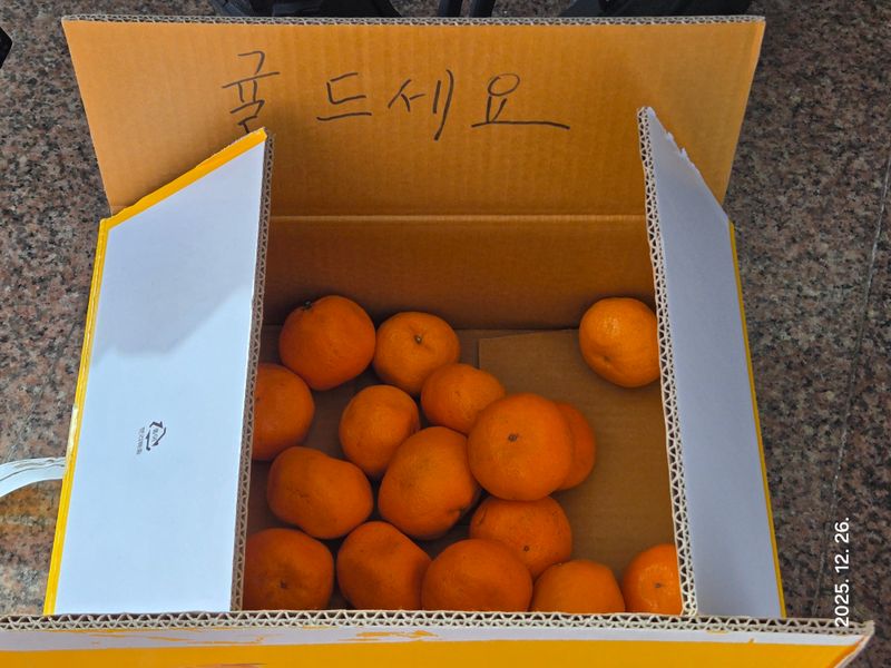 요즈음 제주에는 감귤이 넘쳐납니다. 눈이 오기 전 귤울 따야하는데... 우리야 몇 그루 안되는 귤울 따서 먹고 서율에 사늠 아들에게도 헌 박수 올려보냈습니다.오눌은 금년들어 가장 추워 서울 치감온도가 영하 20°C라는 뉴스를 듣습니다. 그 추위에도 동백꽃이 활짝 피...