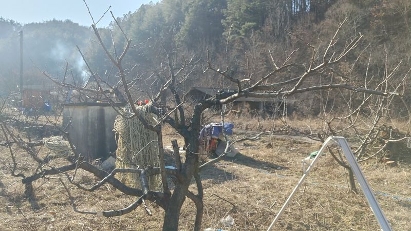 병충해 방재를 위해 살충재+황 살포. 나무밑 제조체 살포